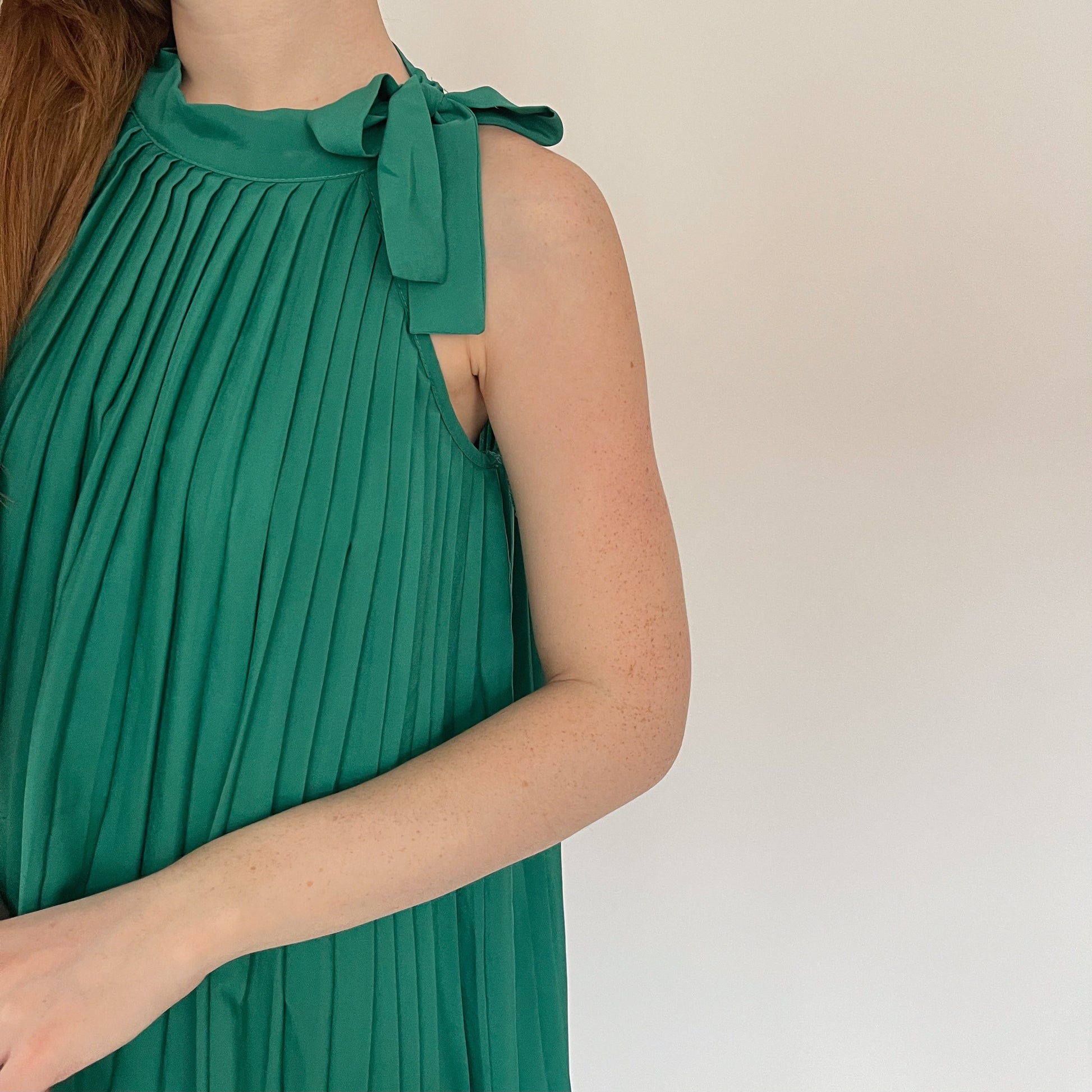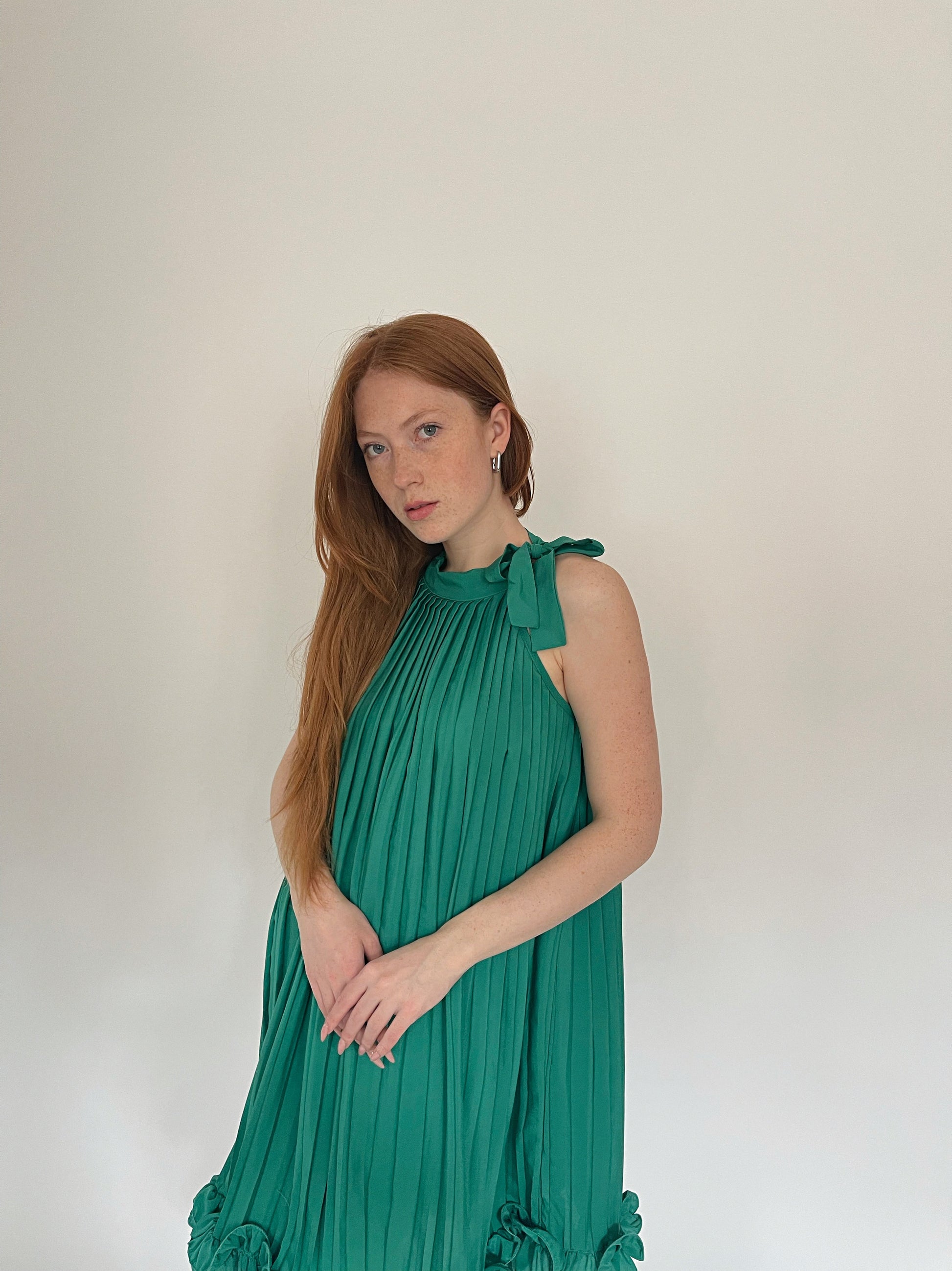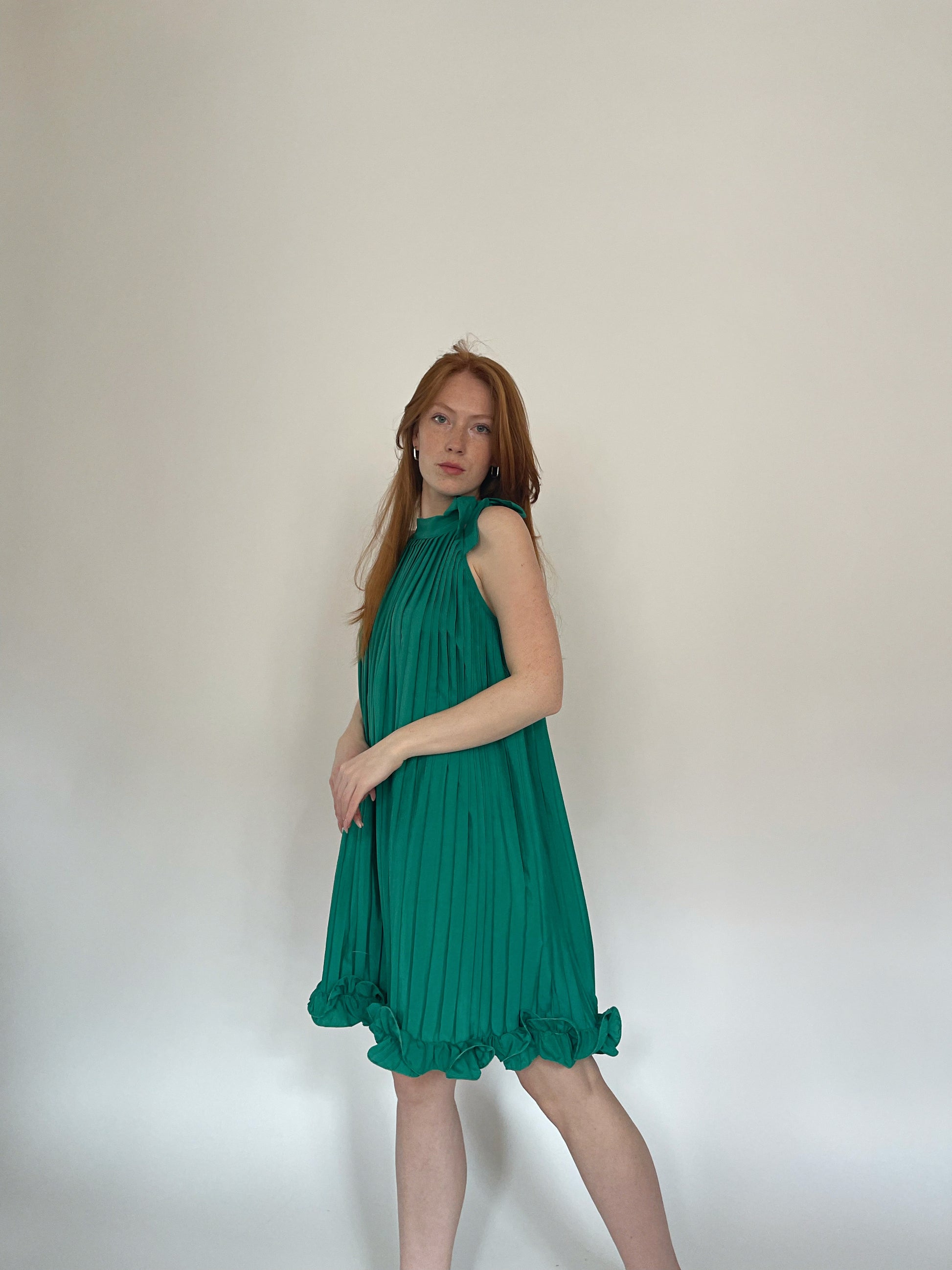 Vintage green pleated mini dress with ruched ruffled hem and neck side bow