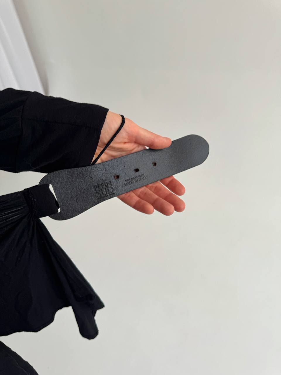 Vintage Plein Sud viscose black draped asymmetrical elastic blouse with sewn leather belt