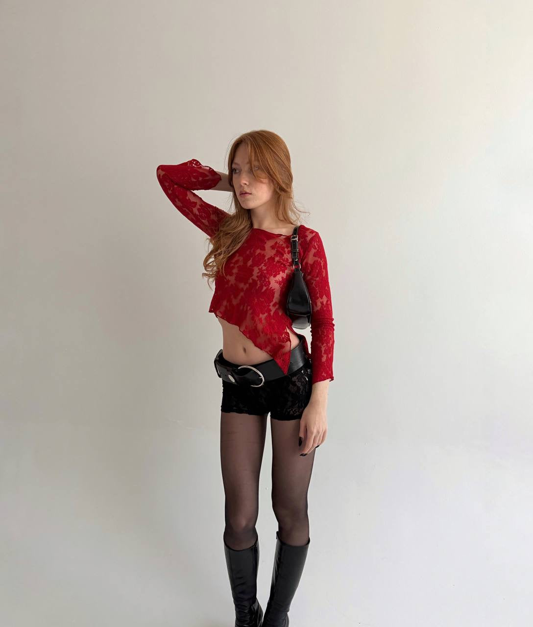 Vintage red mesh asymmetrical blouse