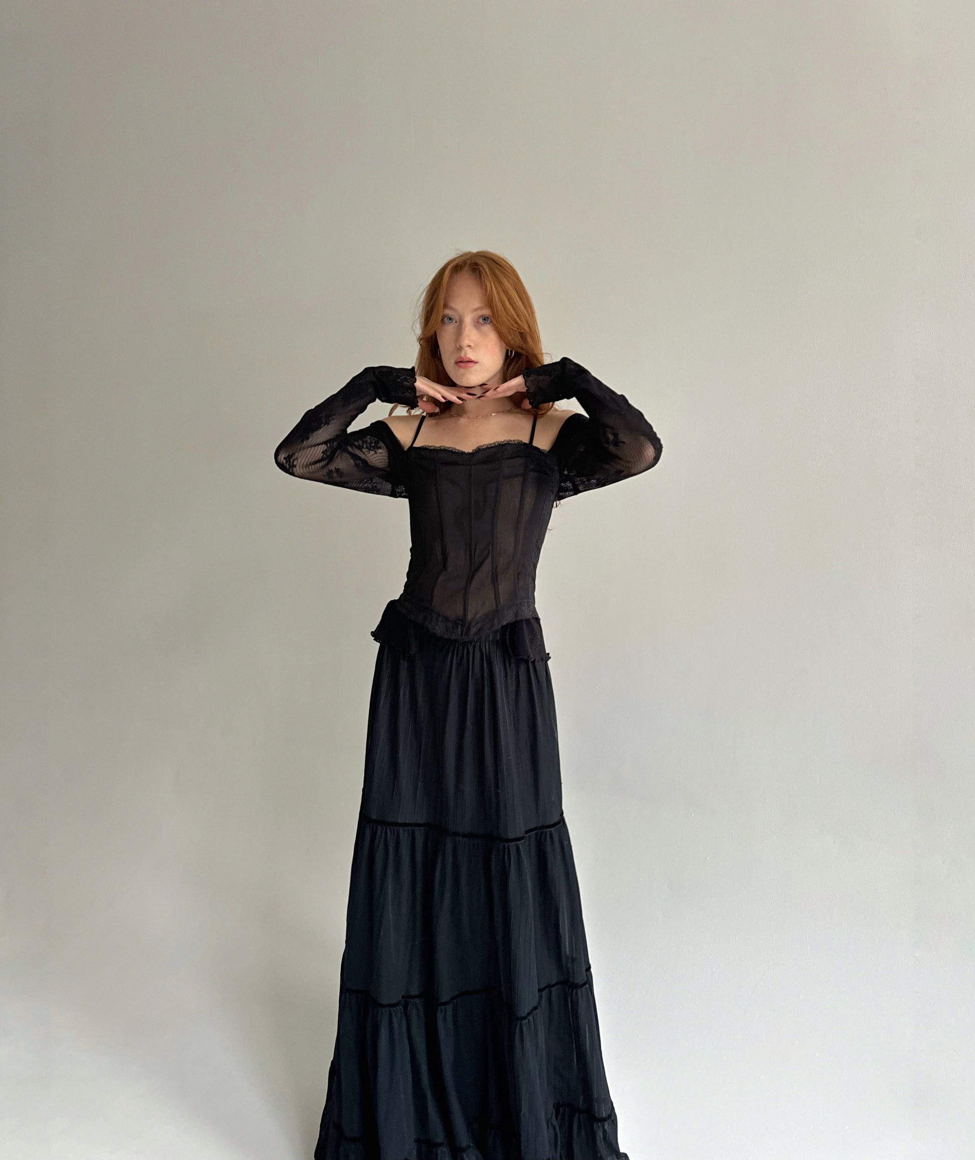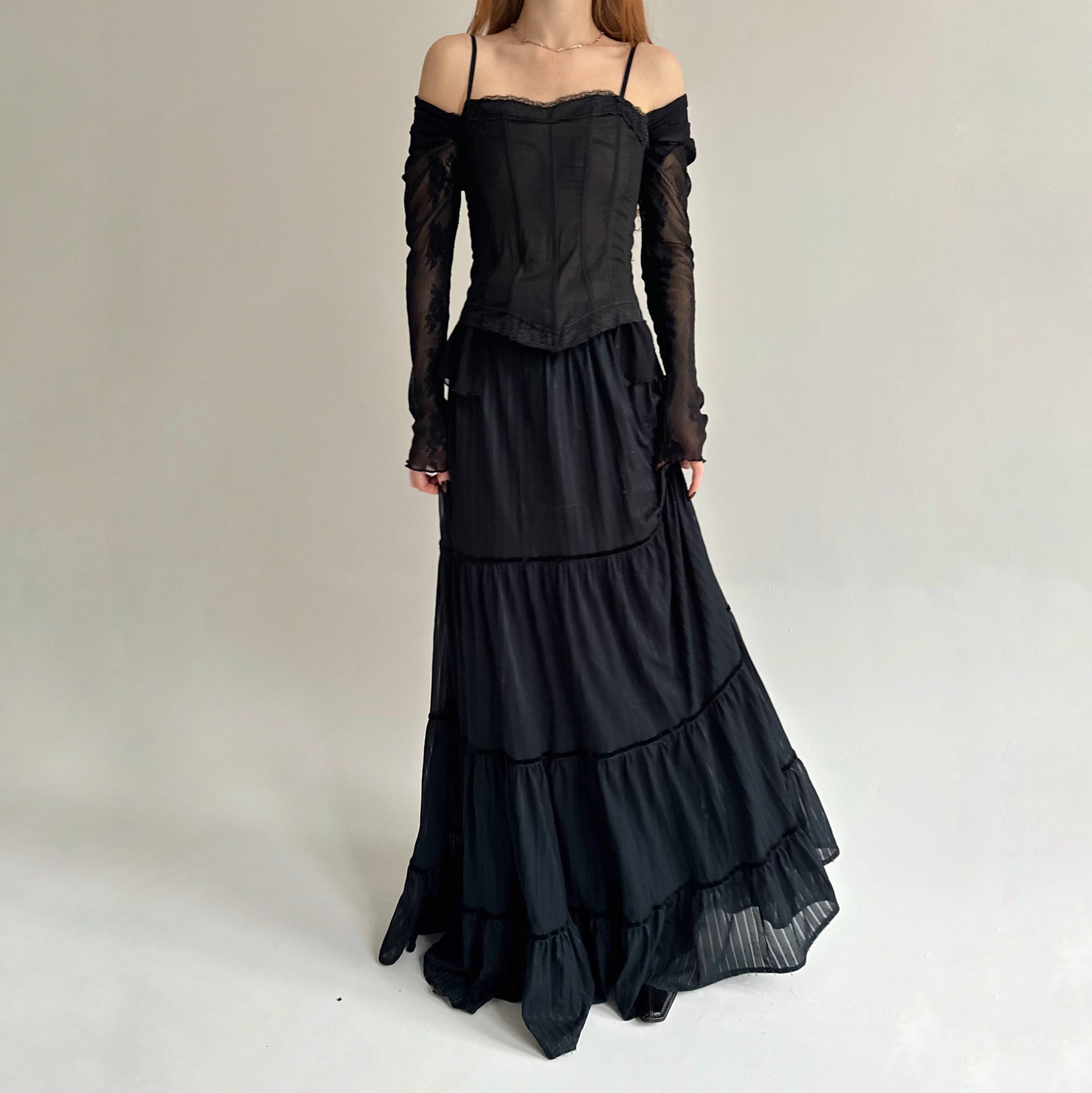 Vintage black ruched maxi skirt with lining