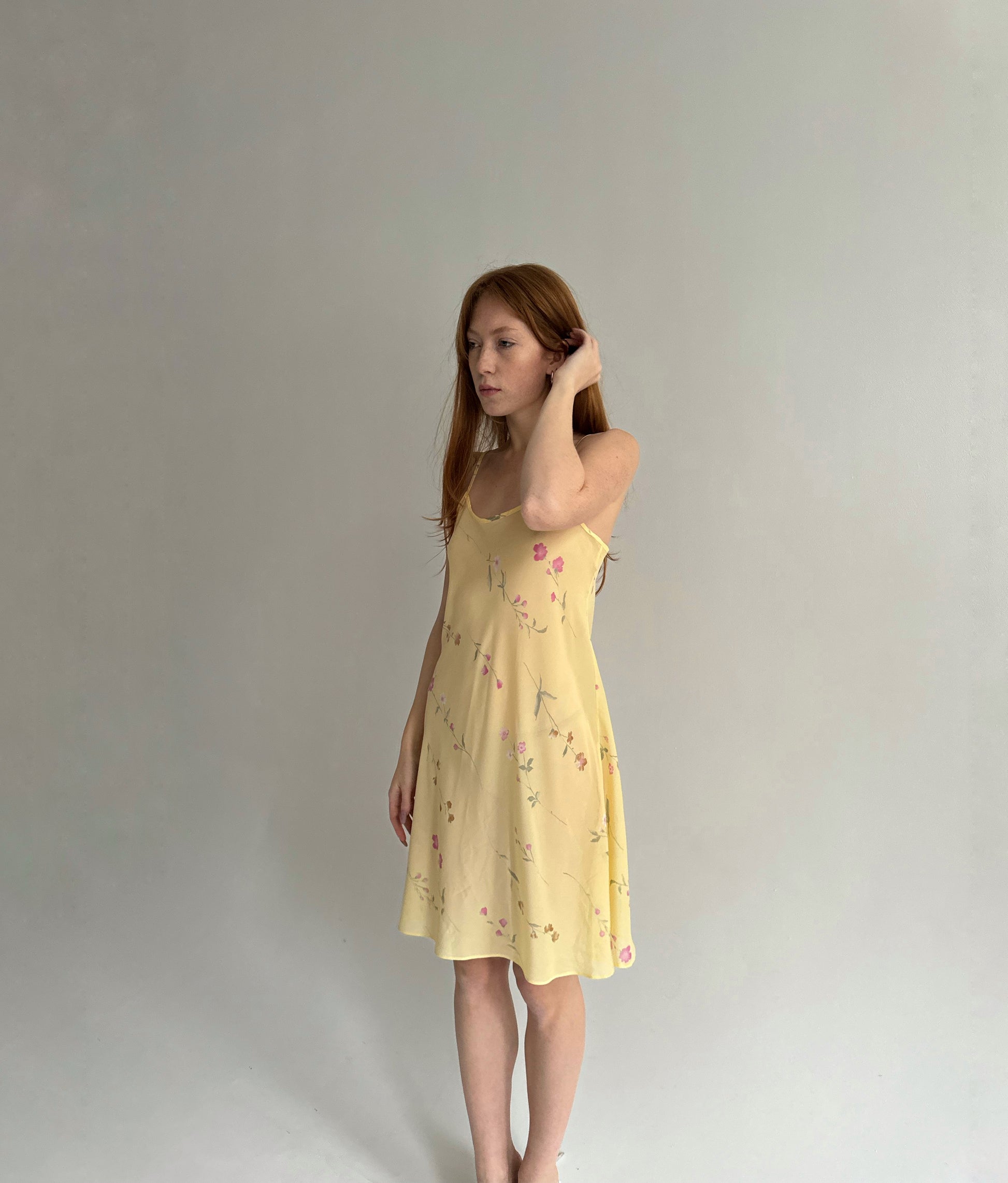 Vintage pastel yellow slip dress with flower pattern