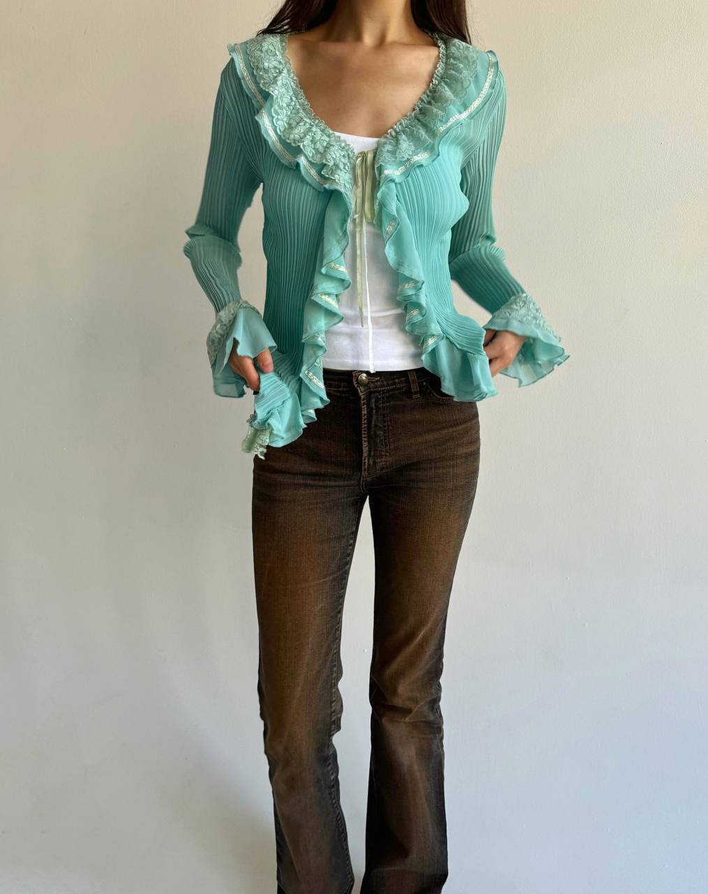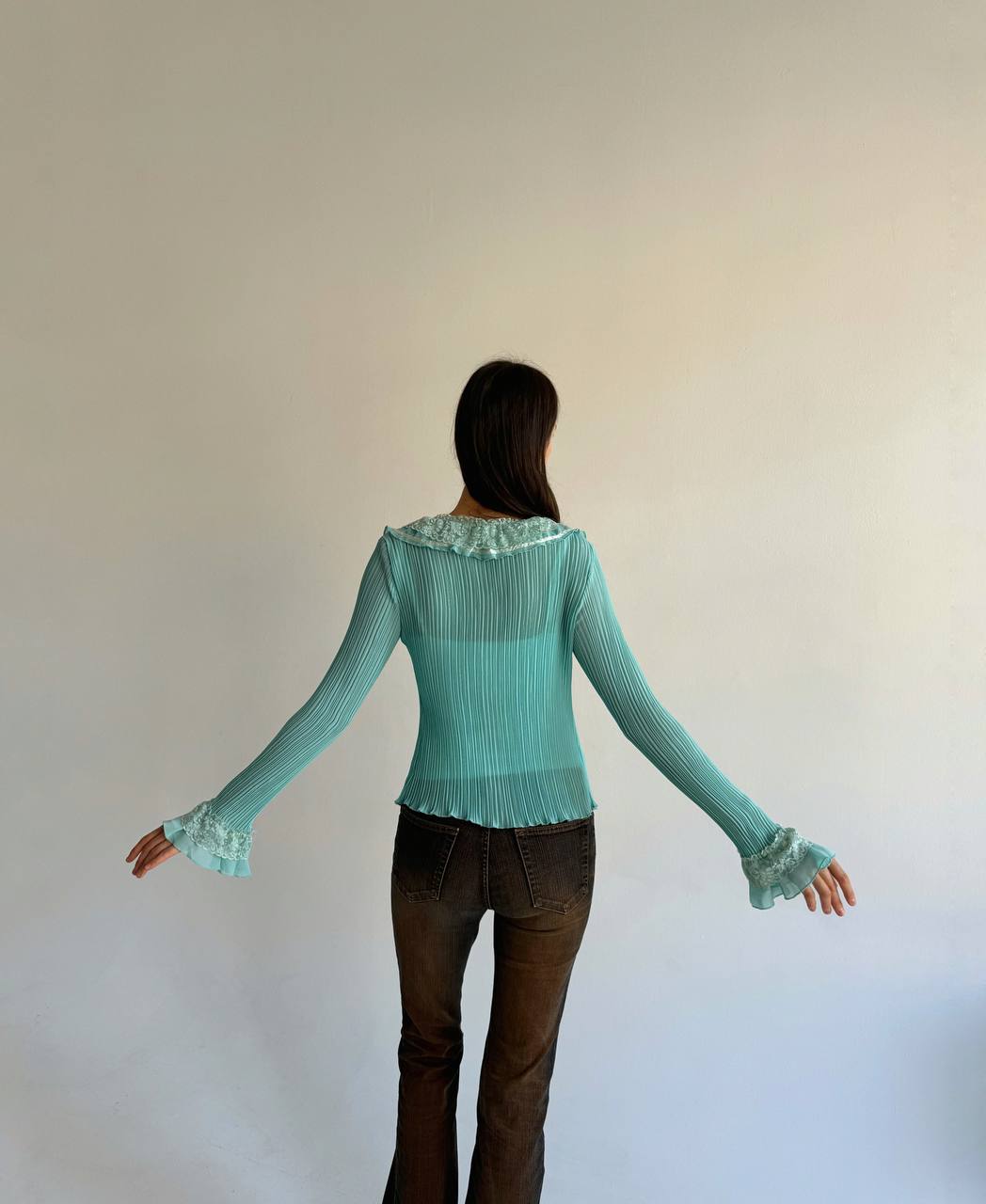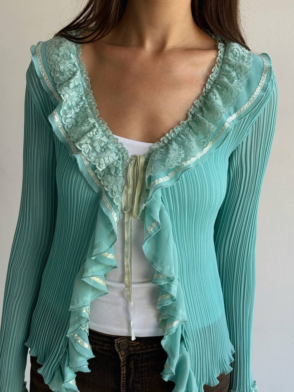 Vintage turquoise semi transparent pleated fairycore blouse with ruffles and lace