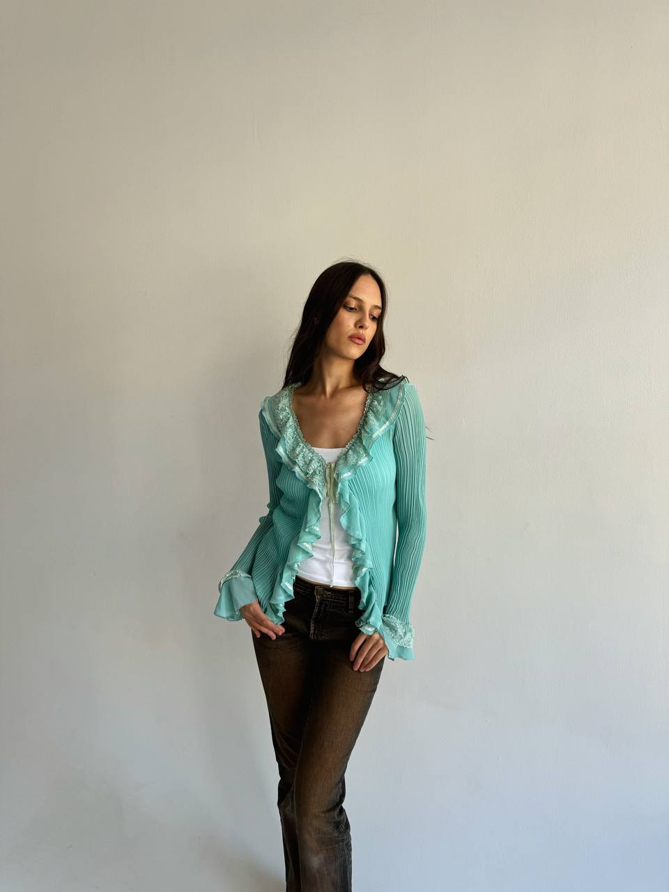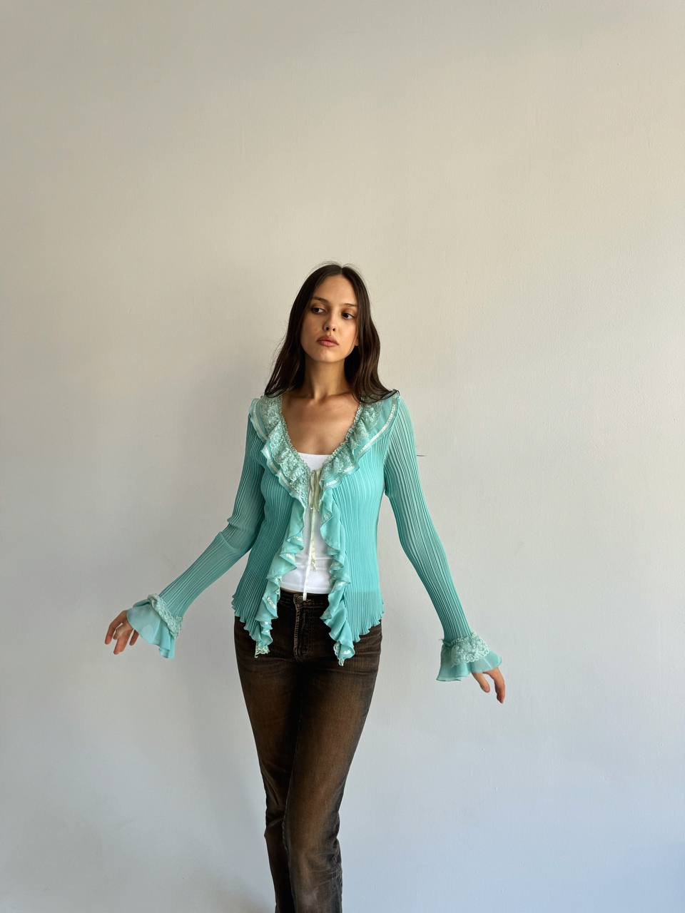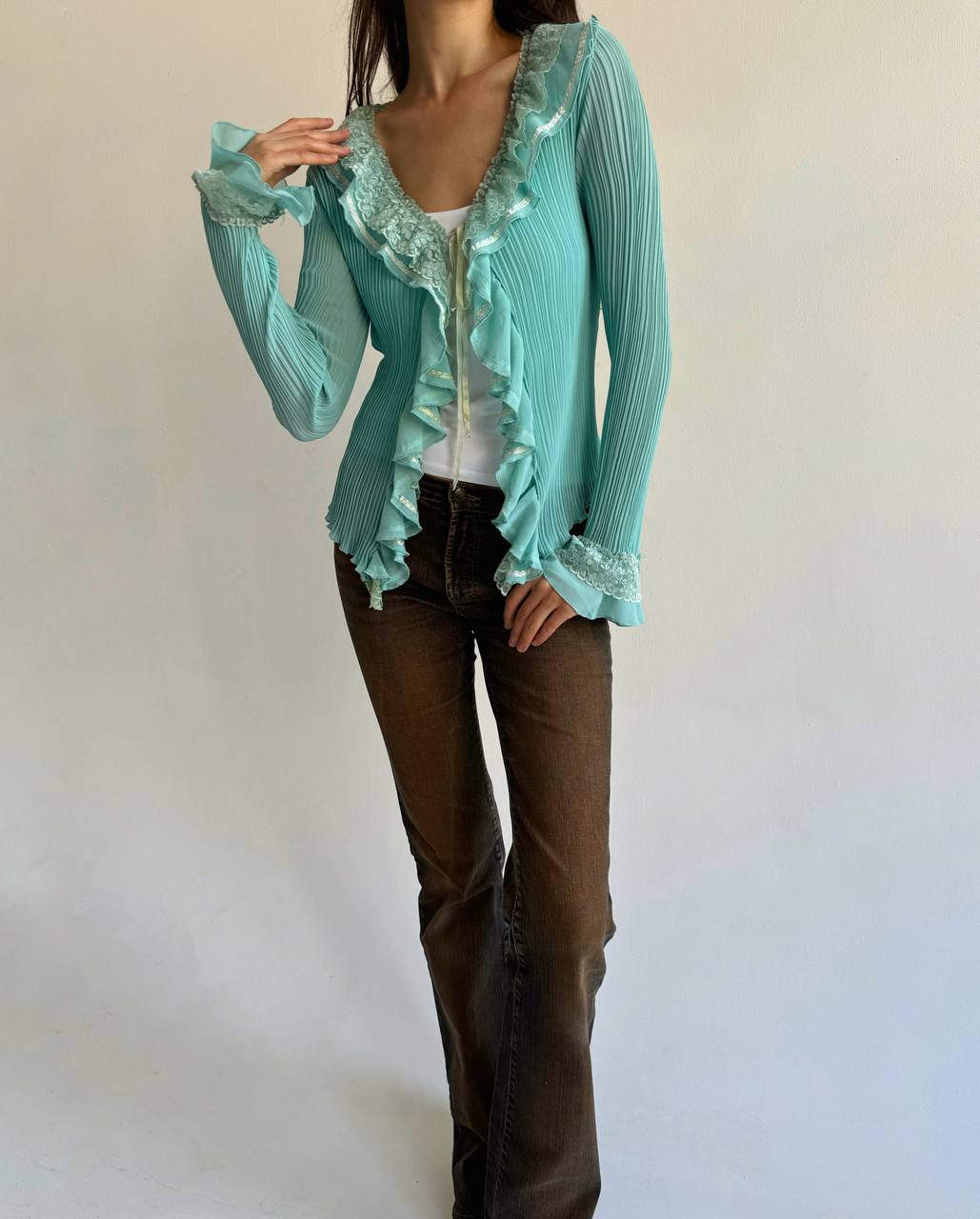 Vintage turquoise semi transparent pleated fairycore blouse with ruffles and lace