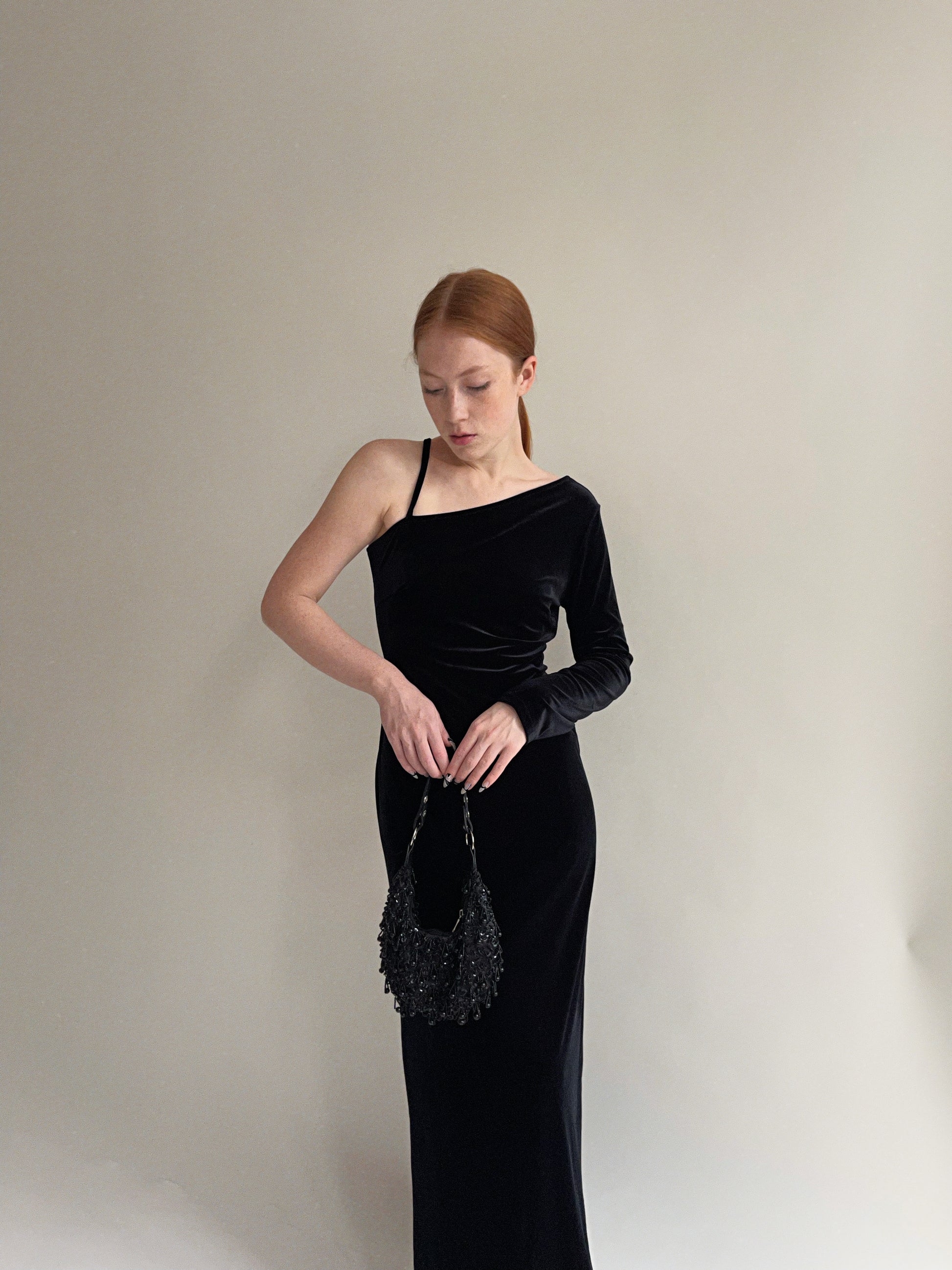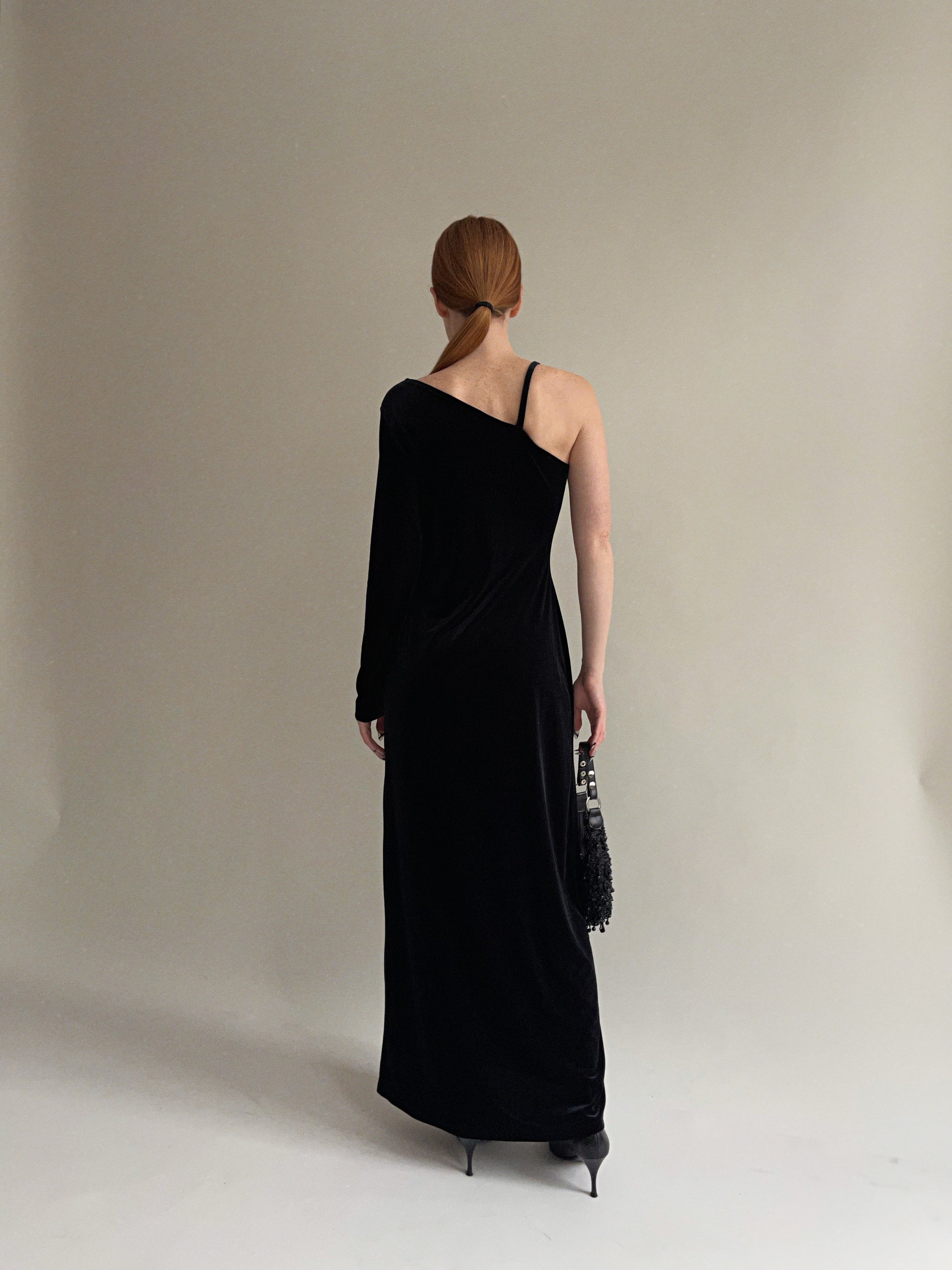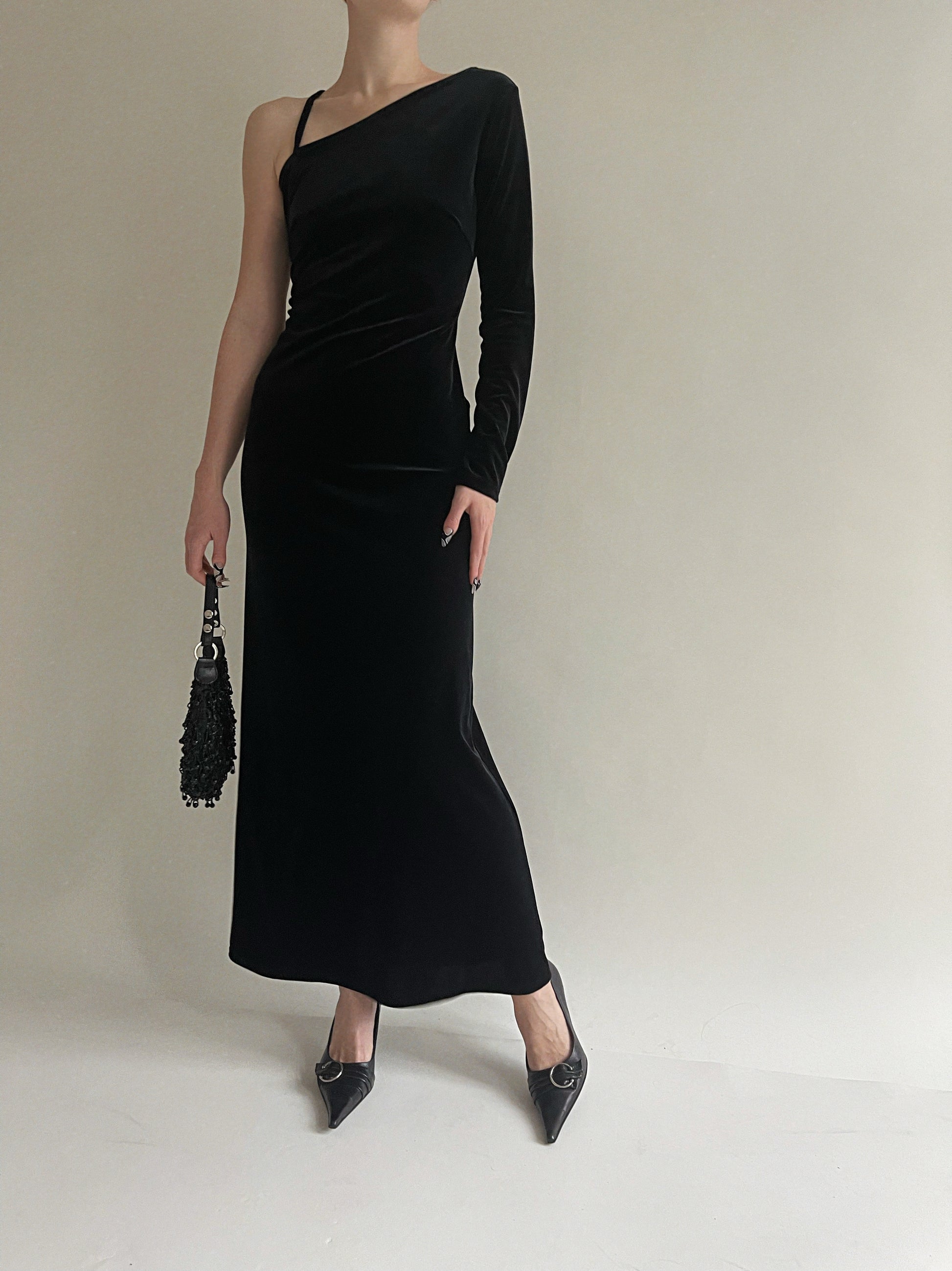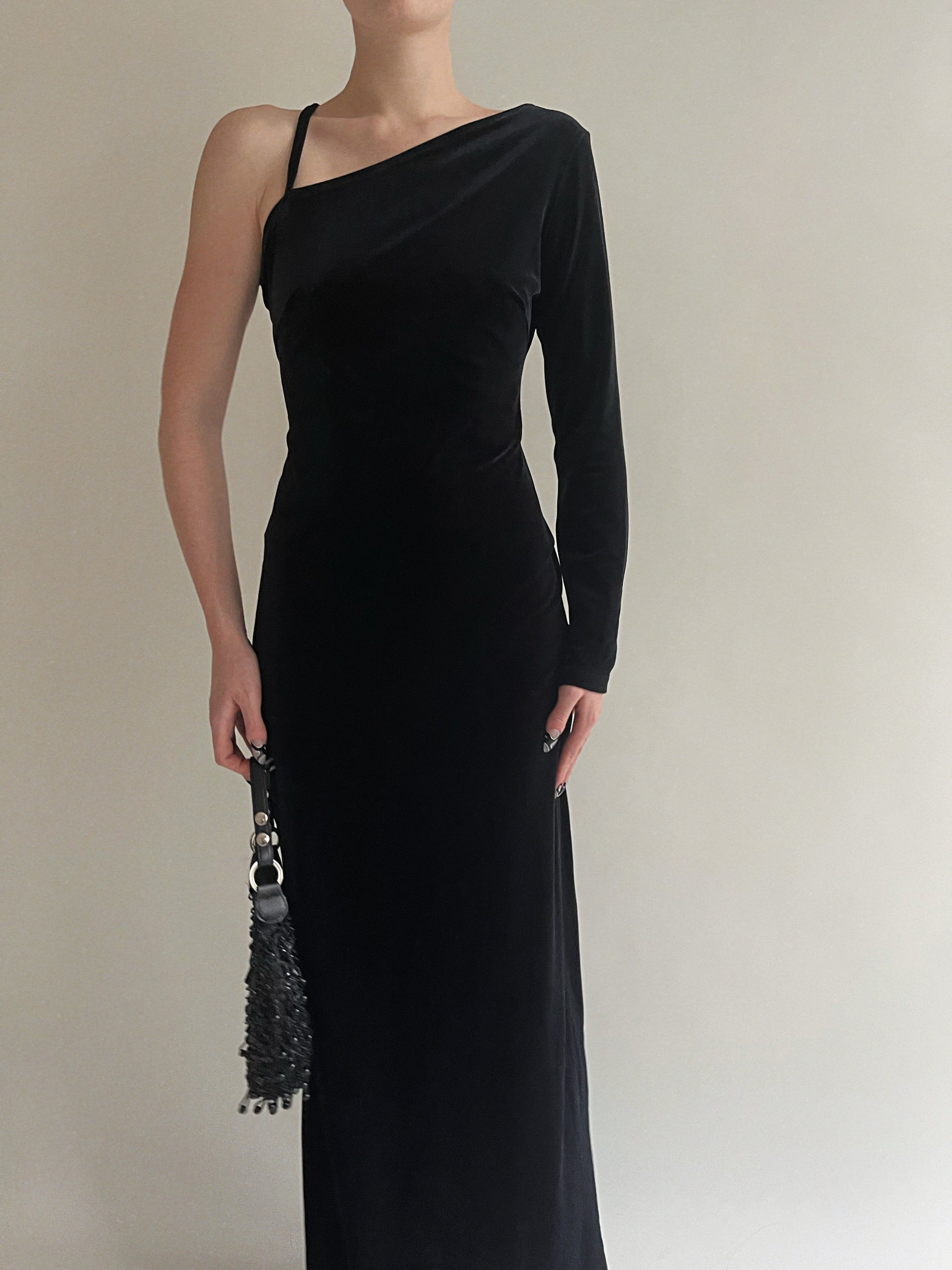 Vintage black velvet one sleeve maxi dress