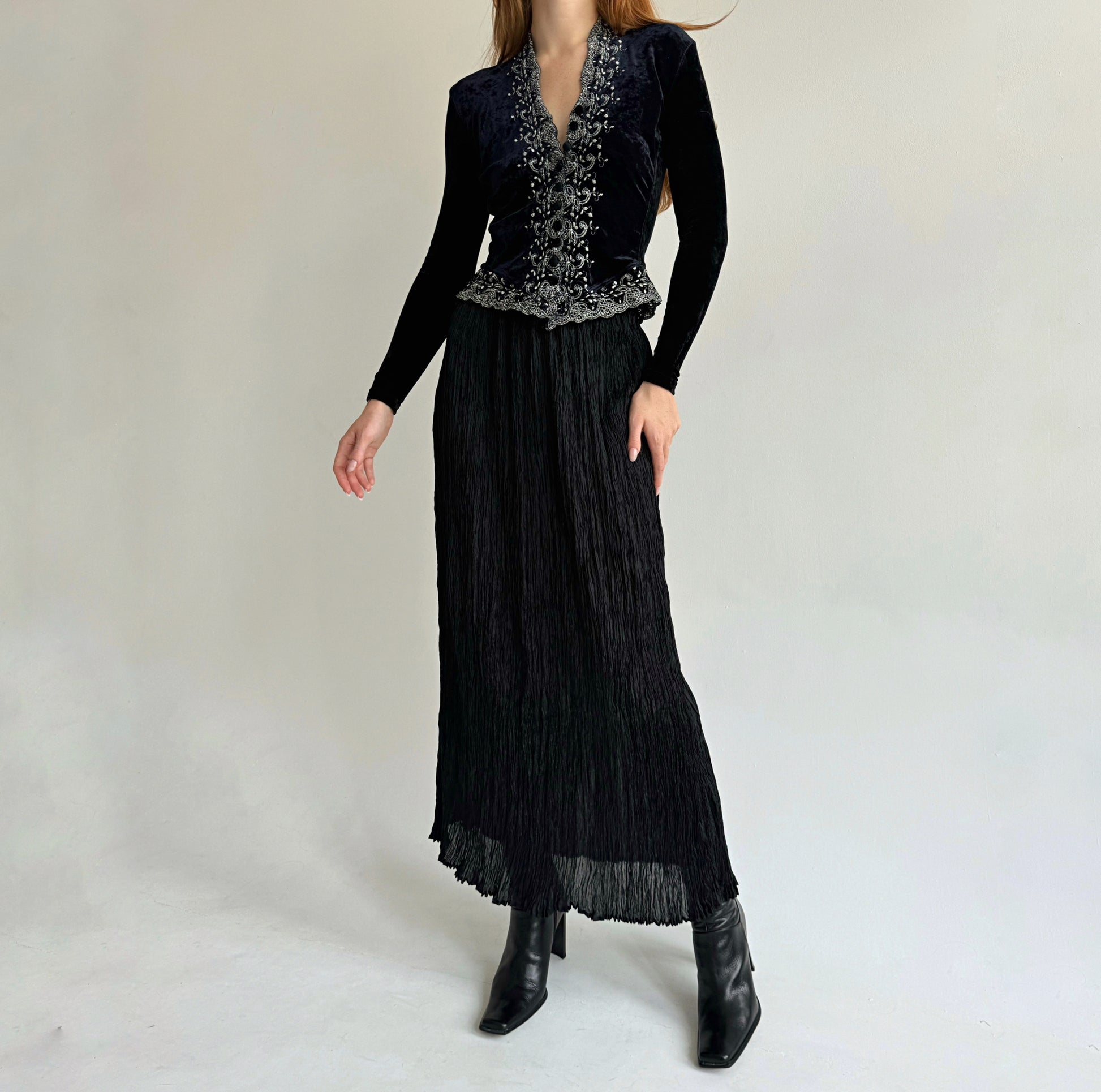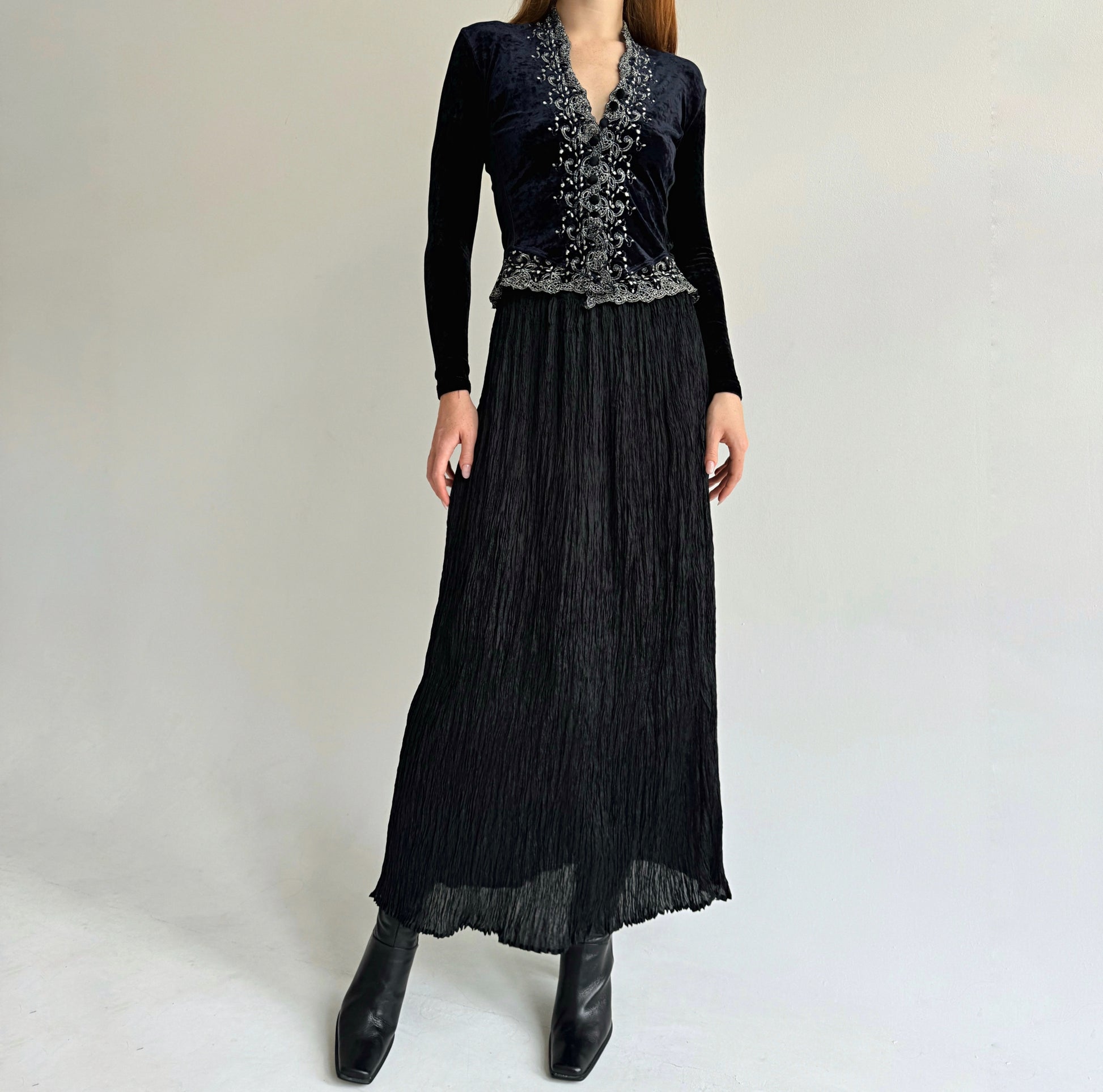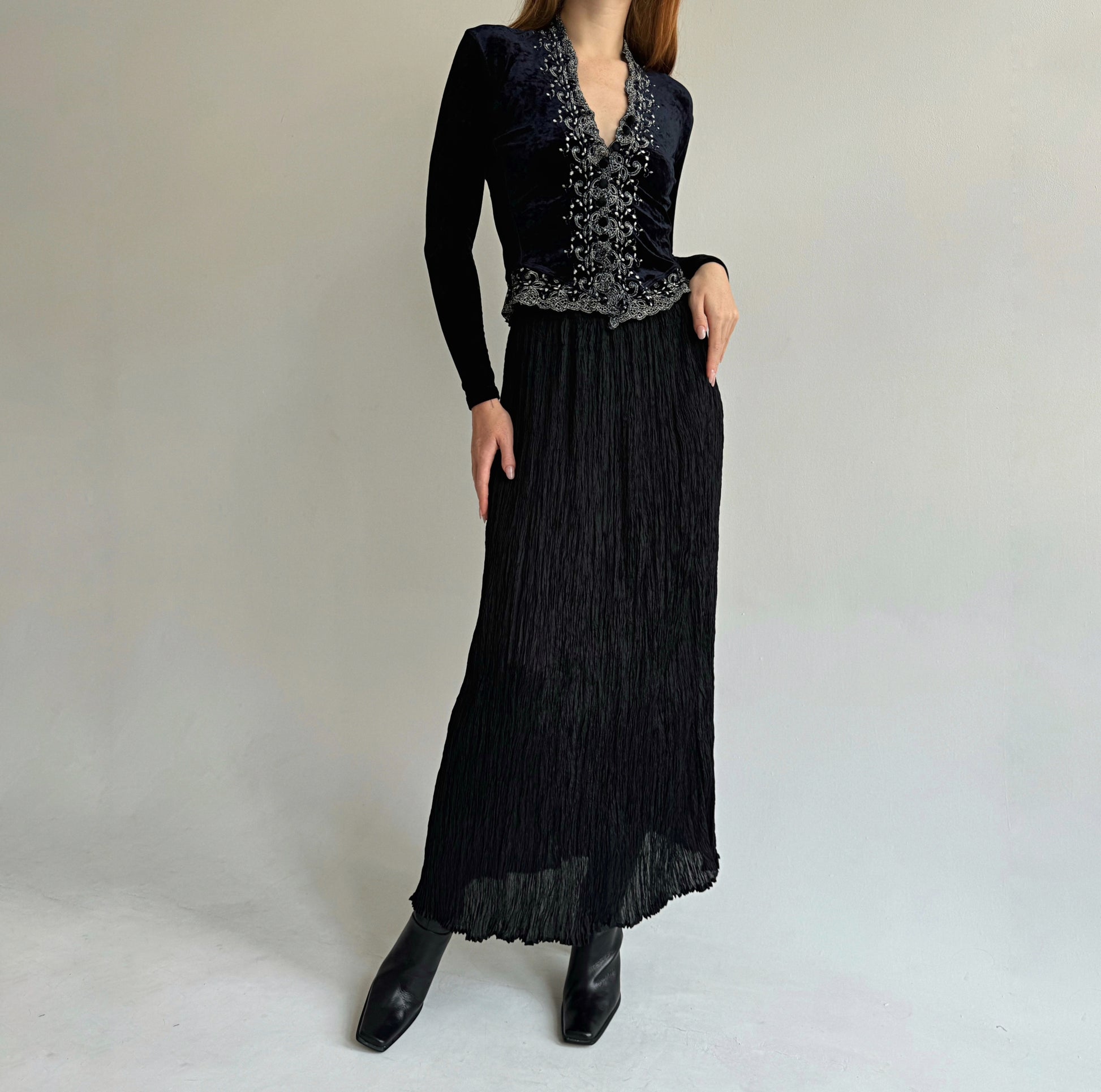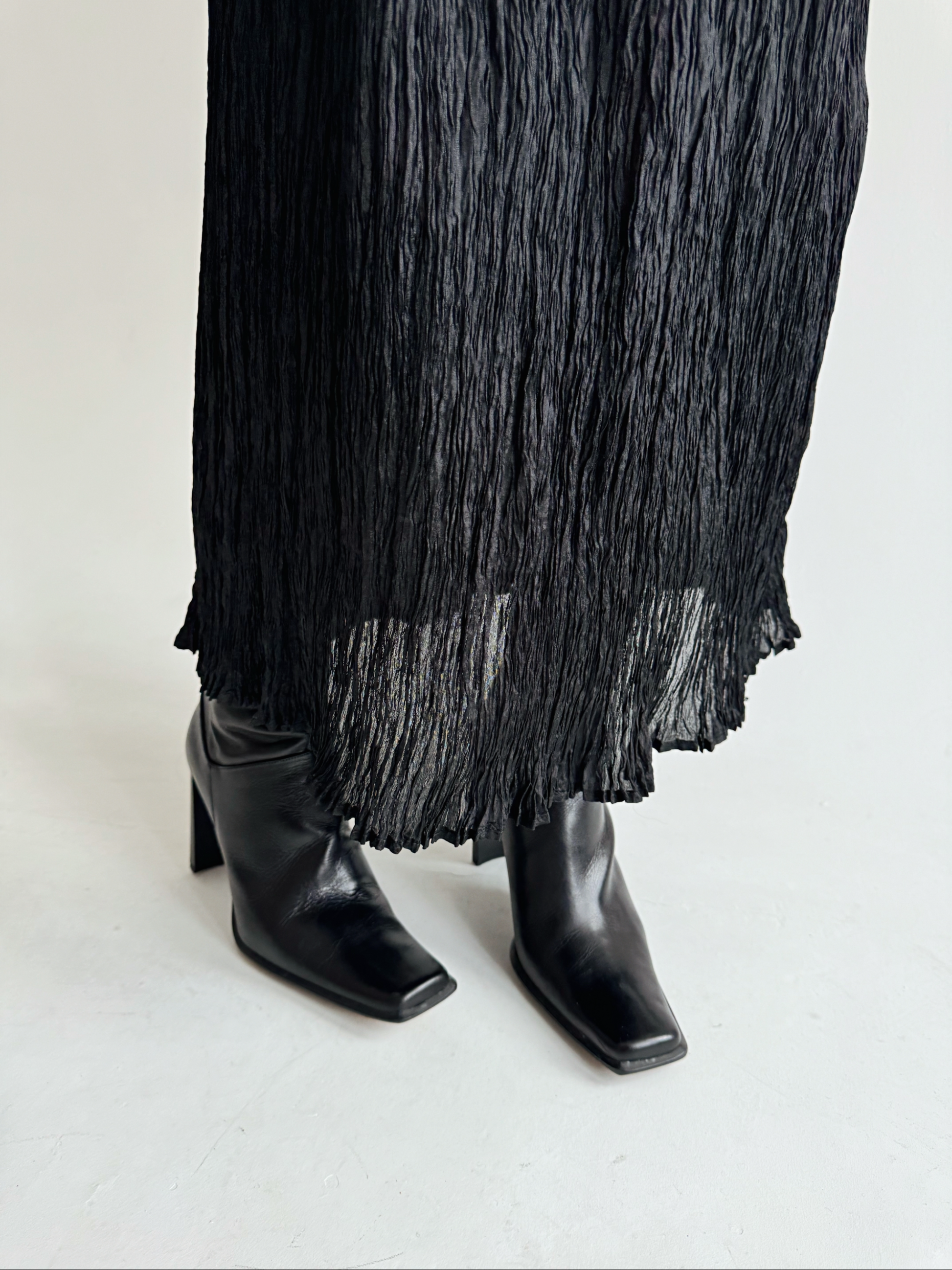 Vintage viscose black semi transparent pleated gathered maxi skirt