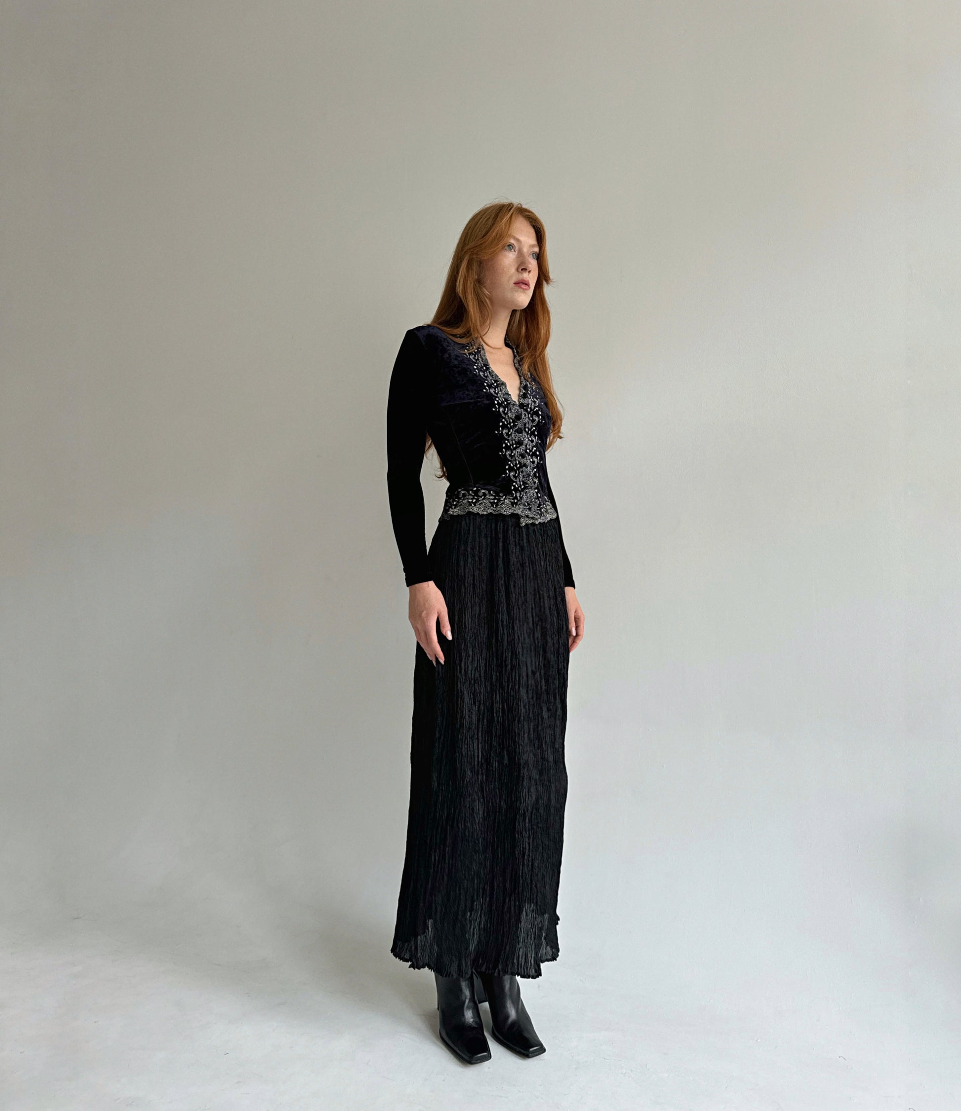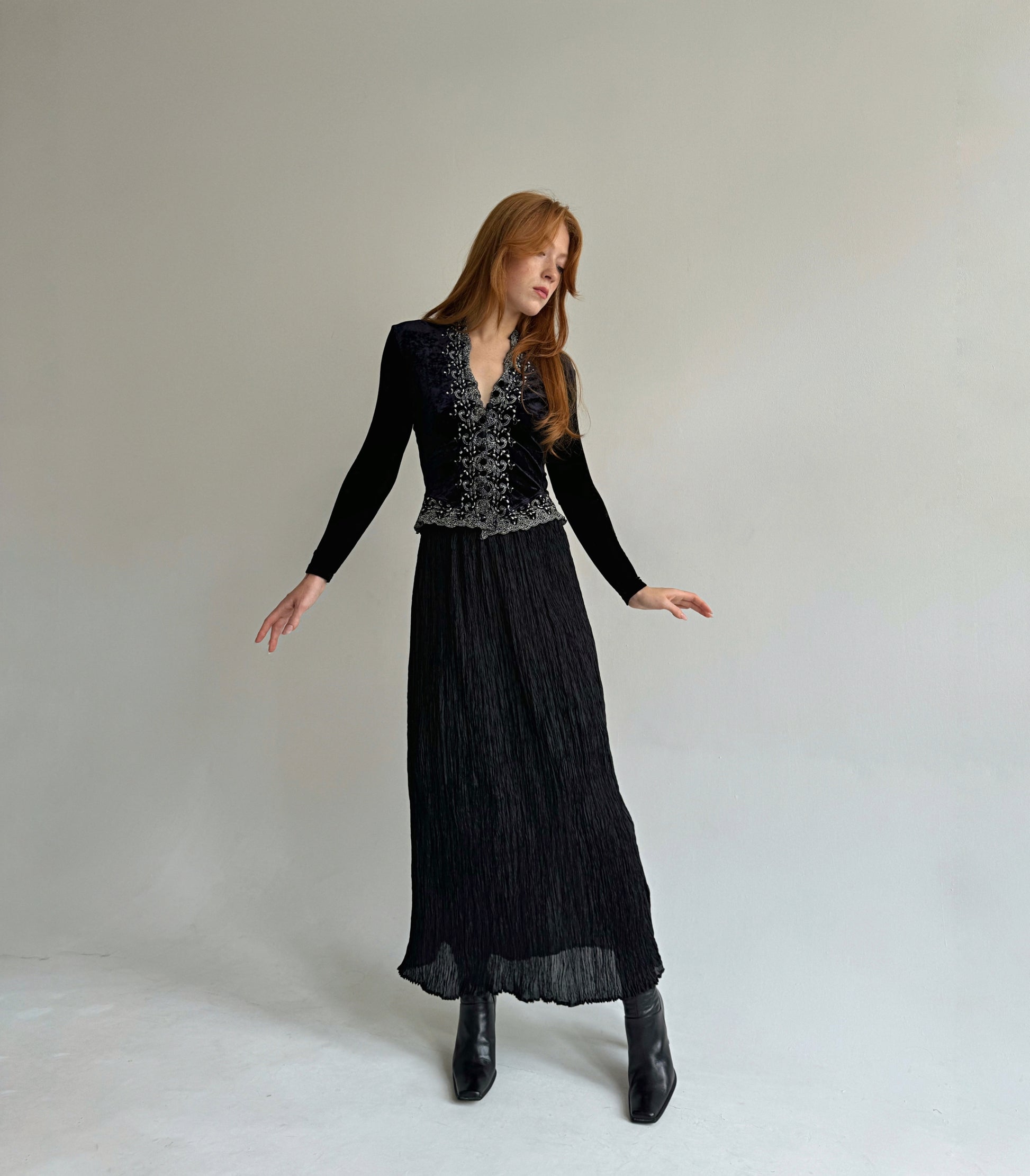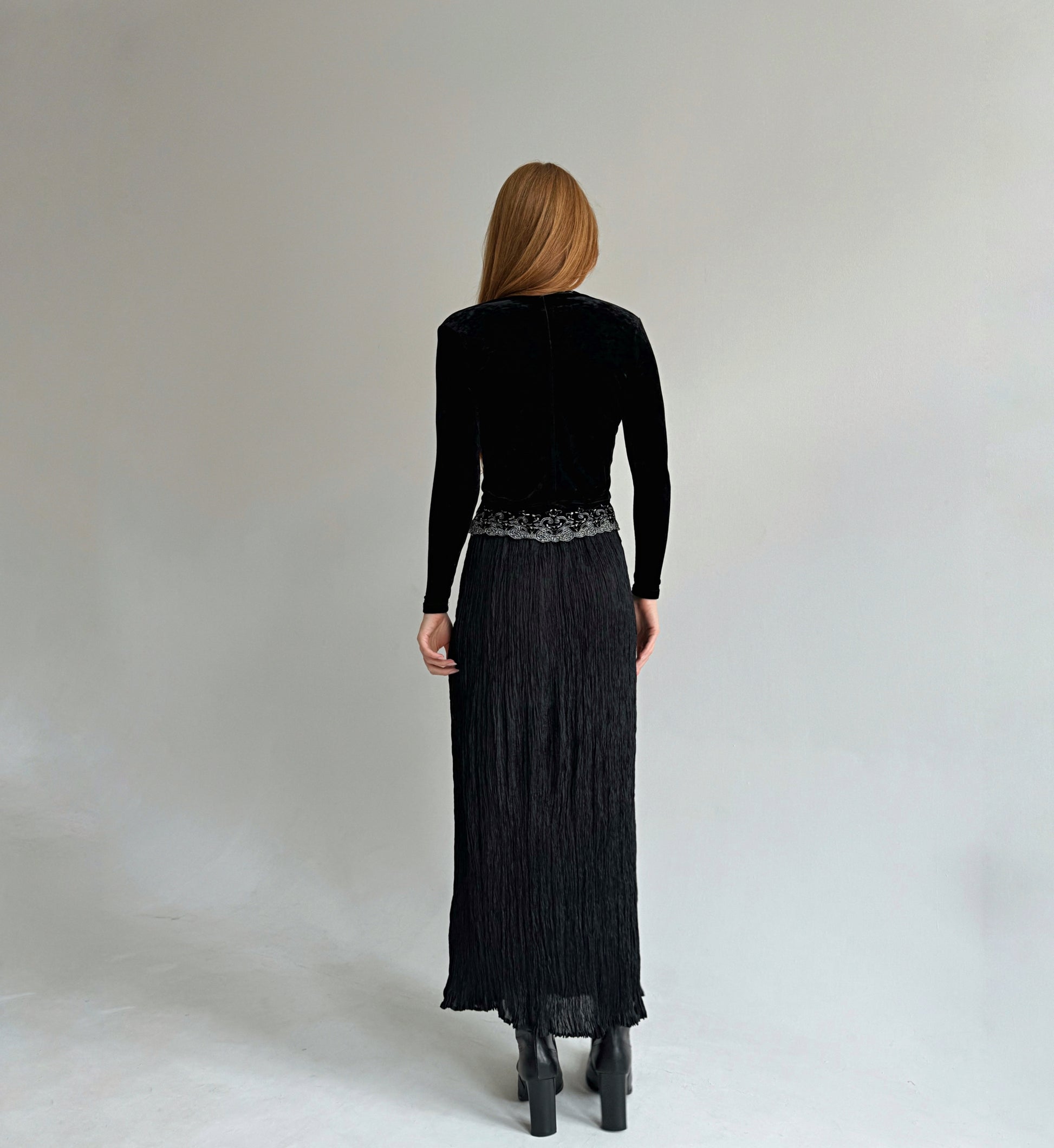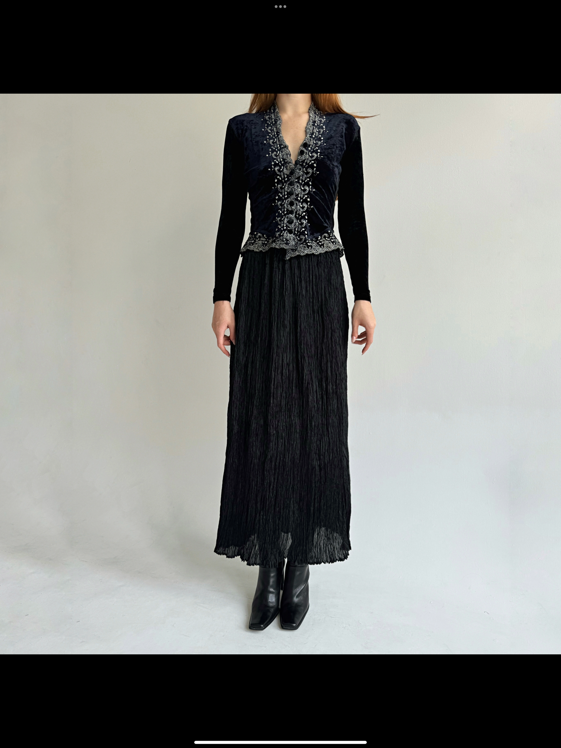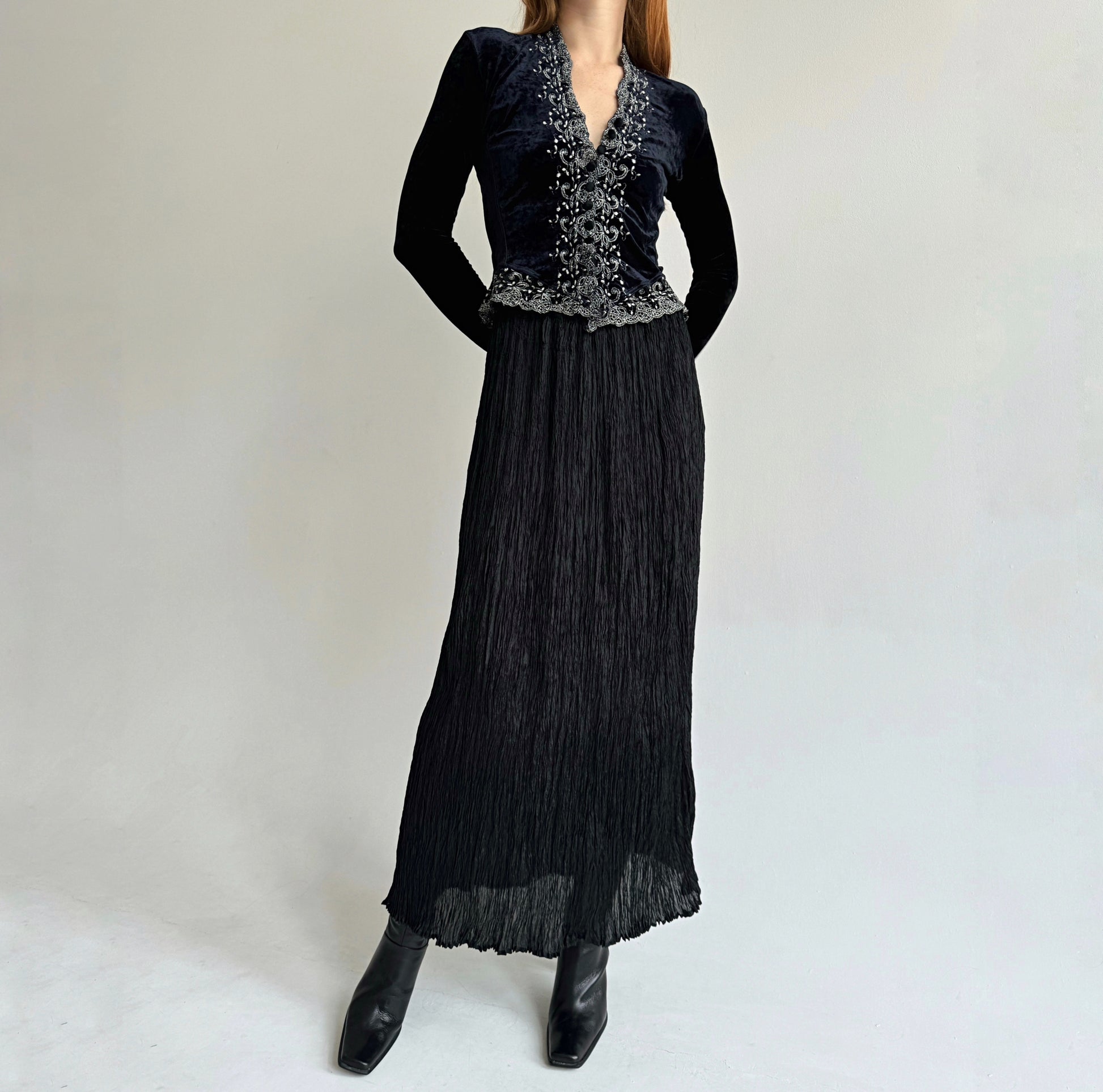 Vintage viscose black semi transparent pleated gathered maxi skirt