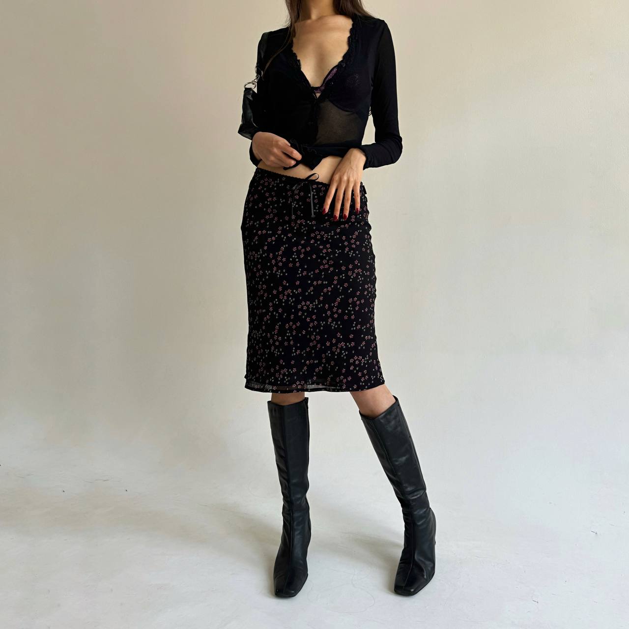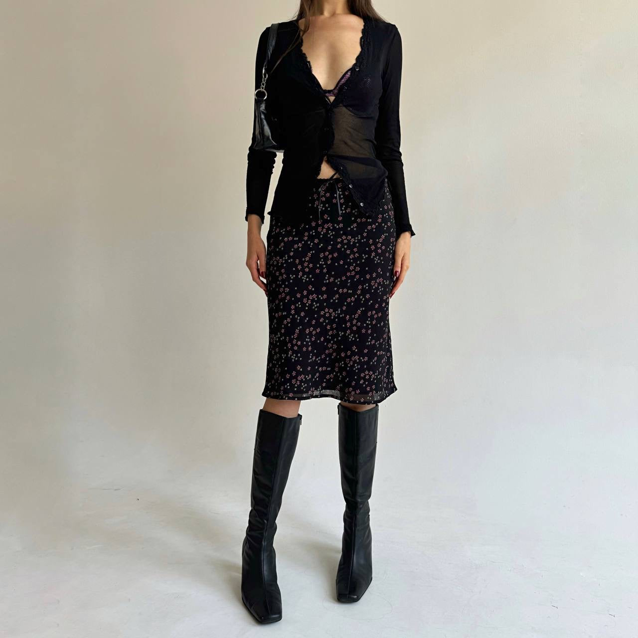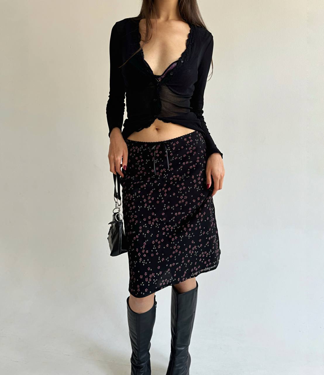 Vintage viscose dainty flowers print in violet black mini skirt with scalloped trim and tiny front bow