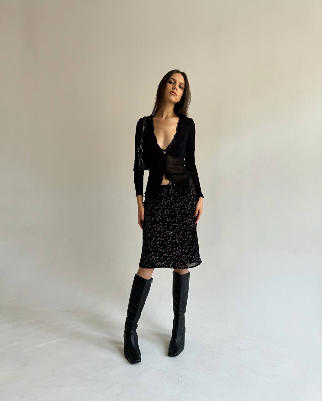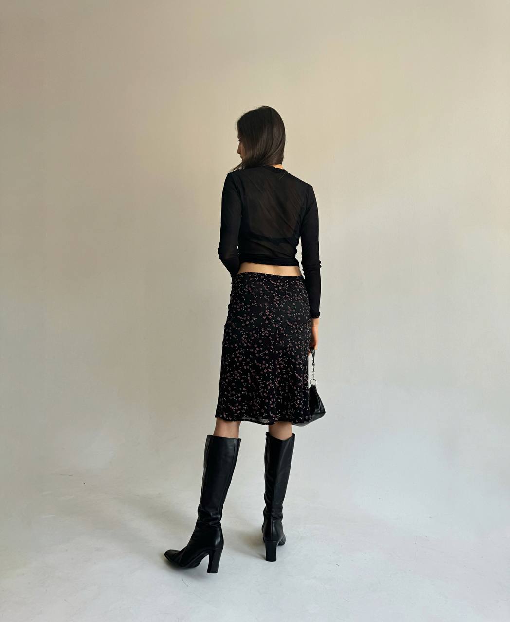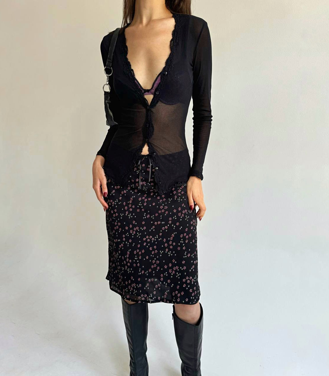 Vintage viscose dainty flowers print in violet black mini skirt with scalloped trim and tiny front bow