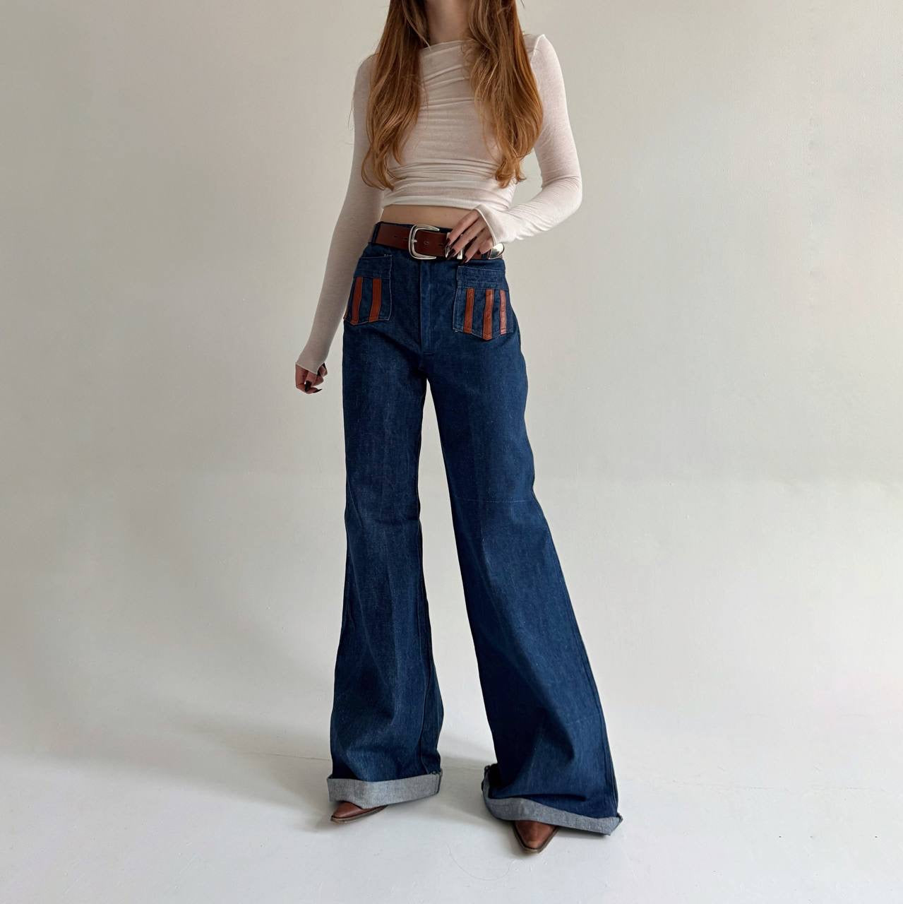 Vintage blue denim wide leg flared long high waisted jeans with leather details