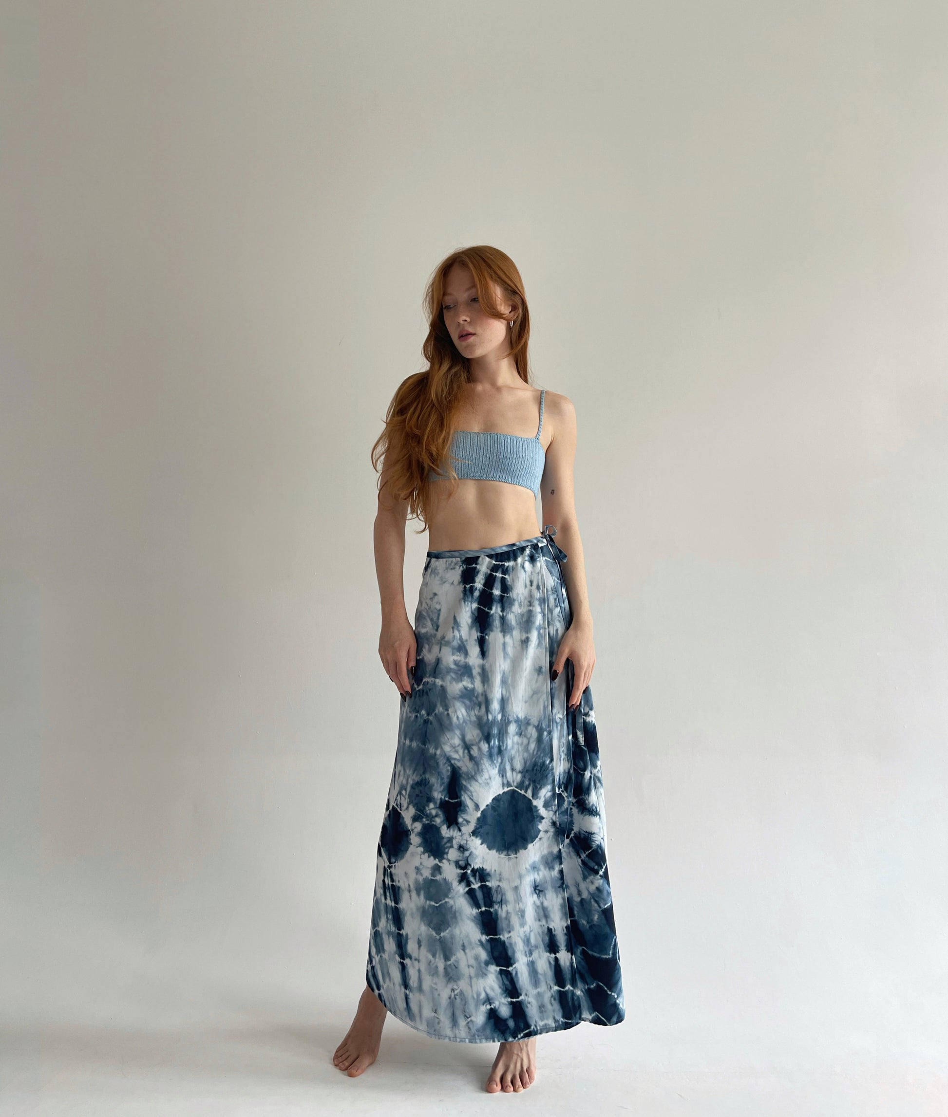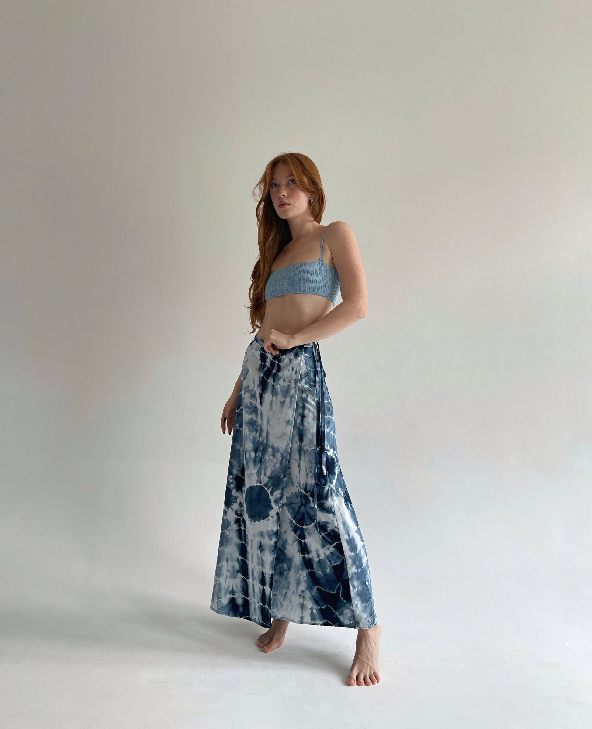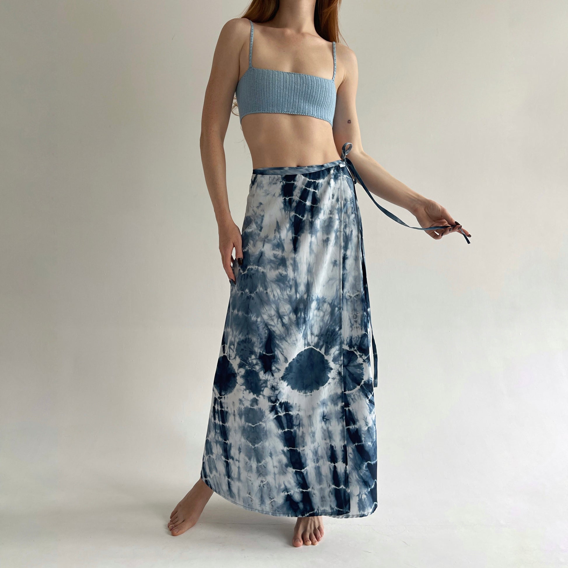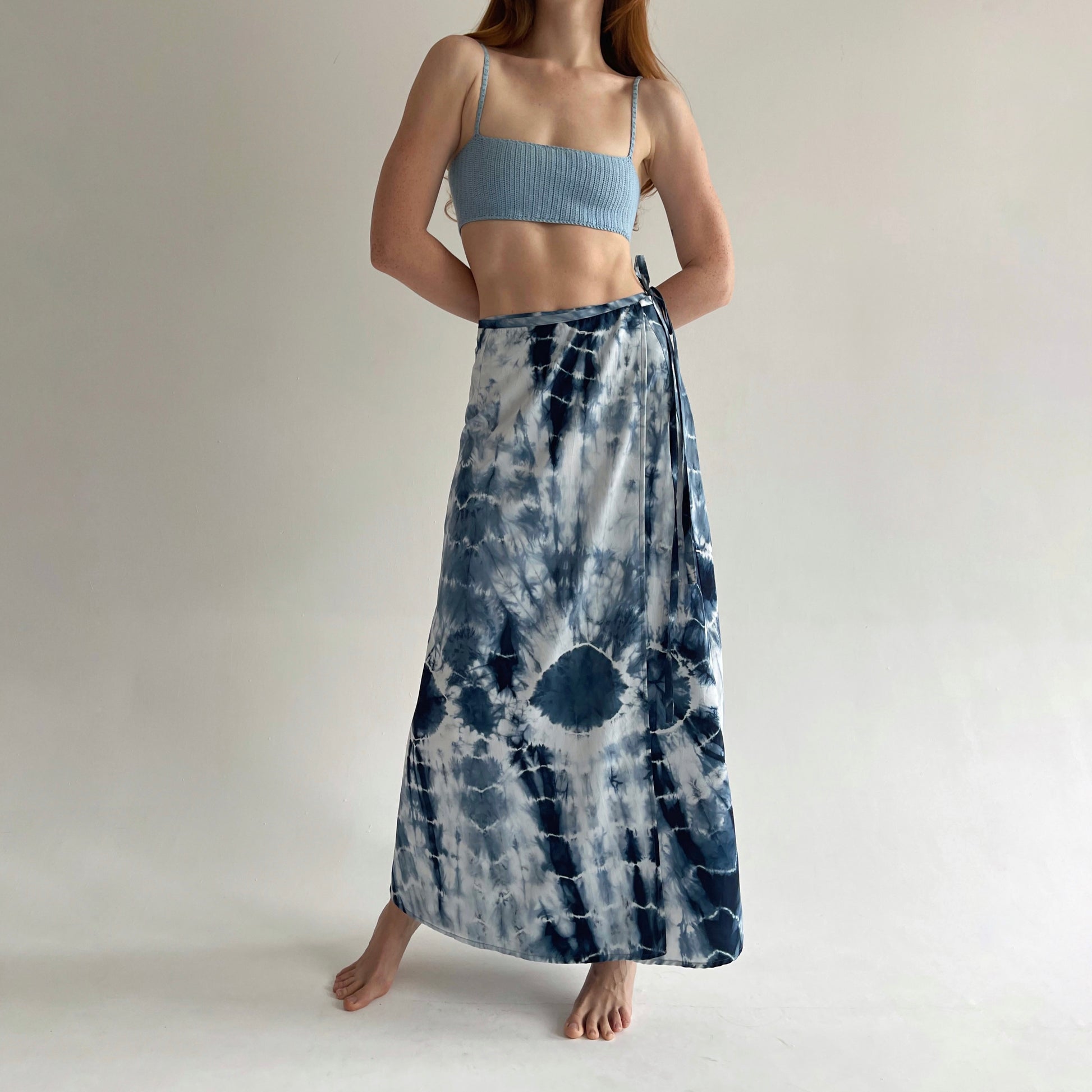 Vintage blue tie dye wrap skirt in maxi length