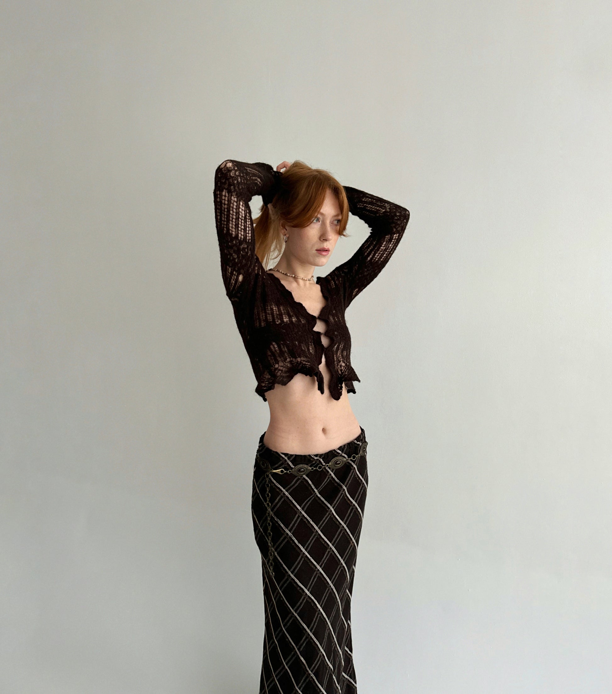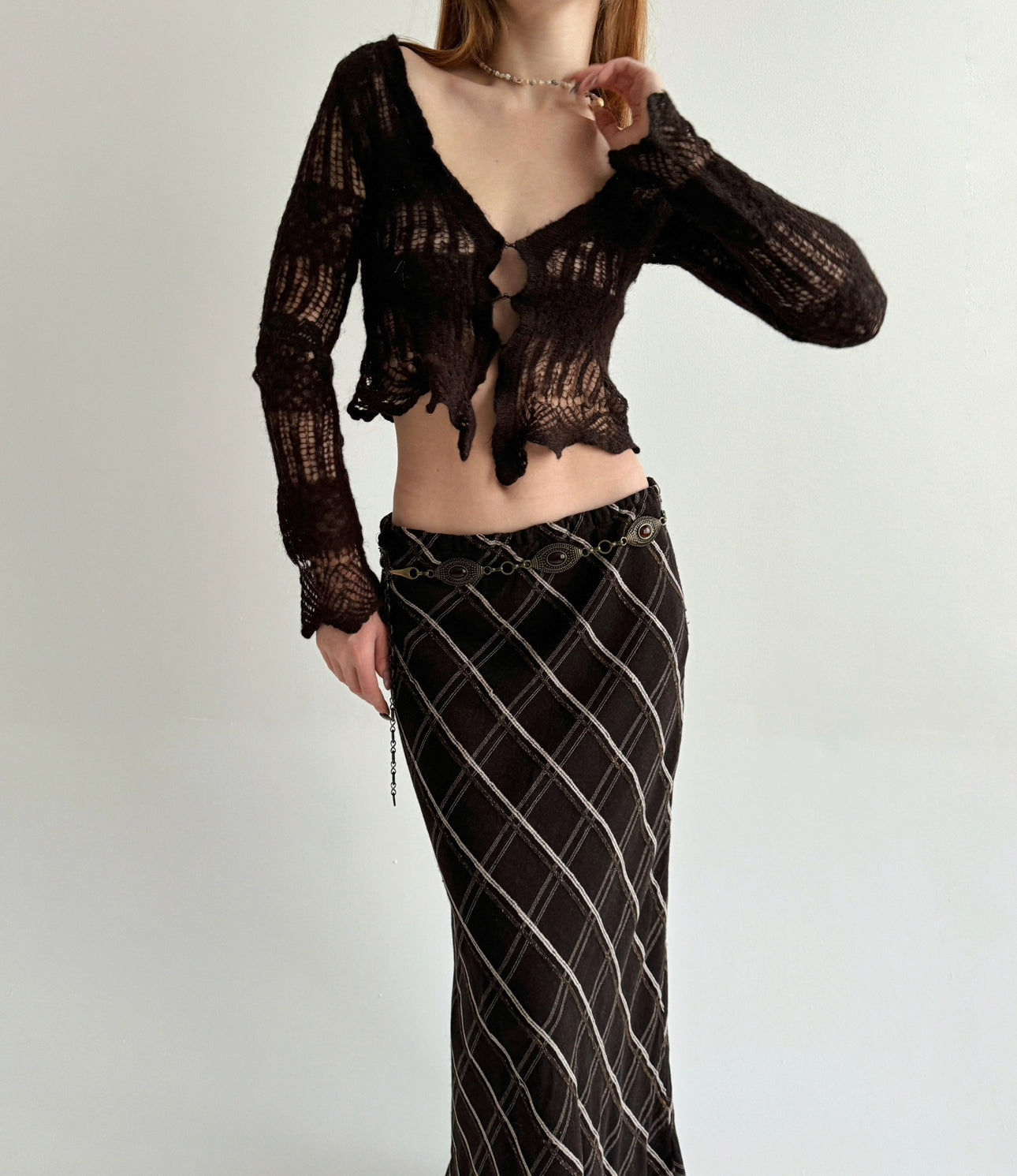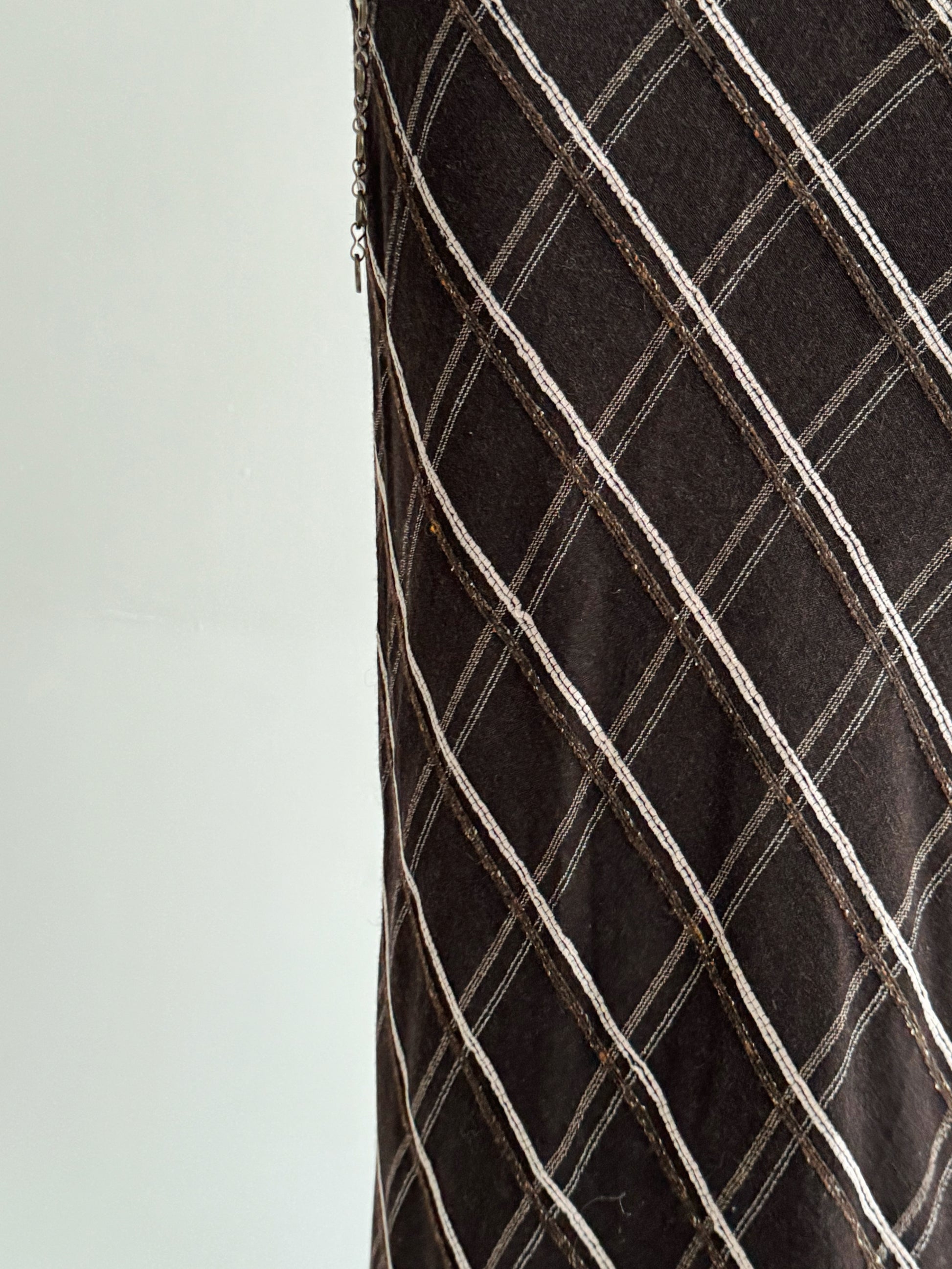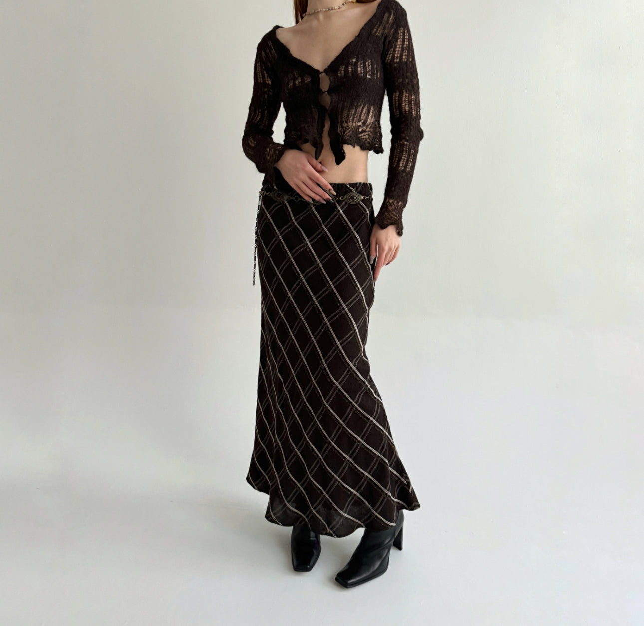 Vintage y2k 71% viscose 21% wool brown checked maxi skirt with white lines