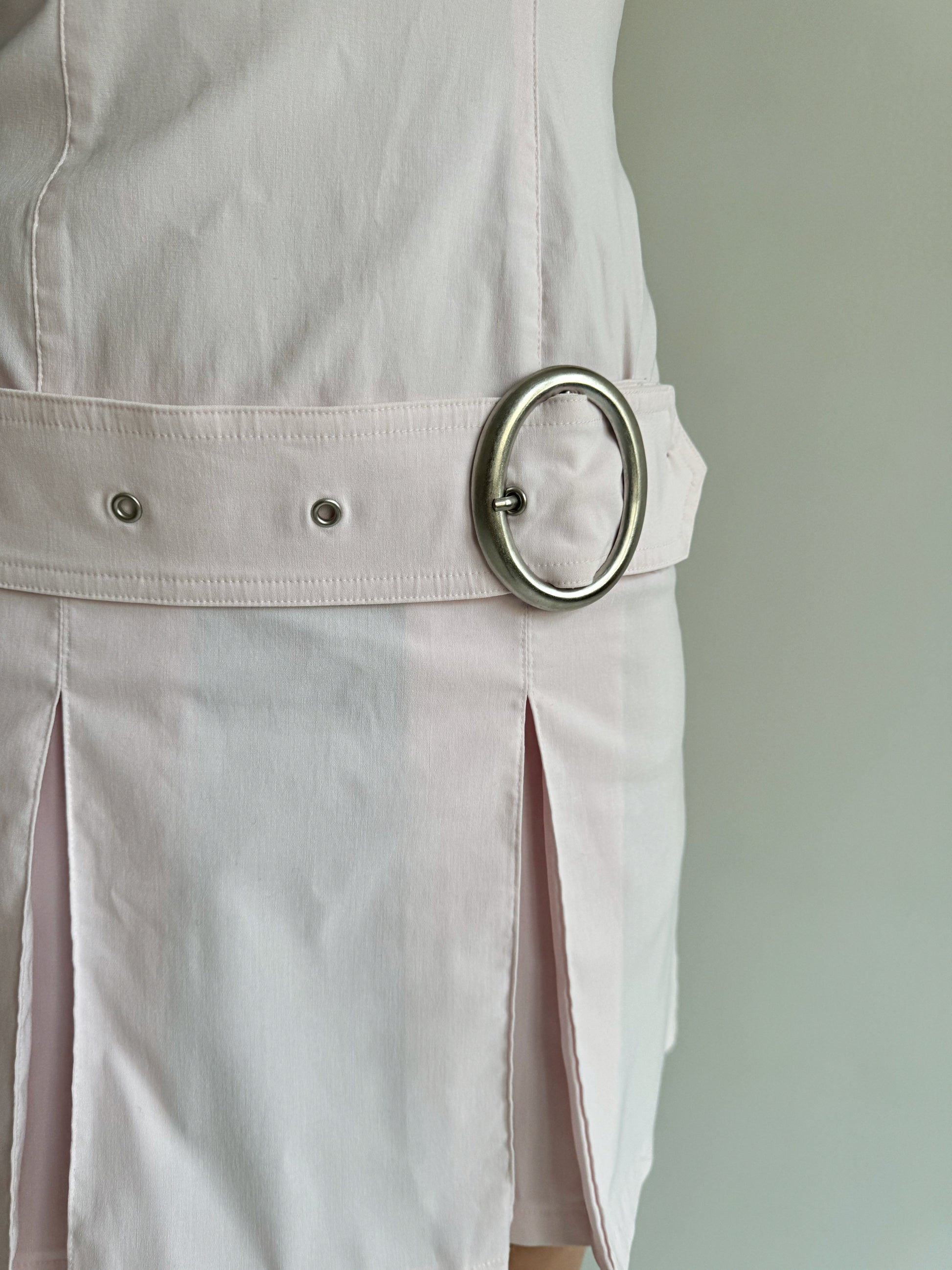 Vintage y2k baby pink viscose blend dress with pleated bottom, sewn belt and silver tone round buckle