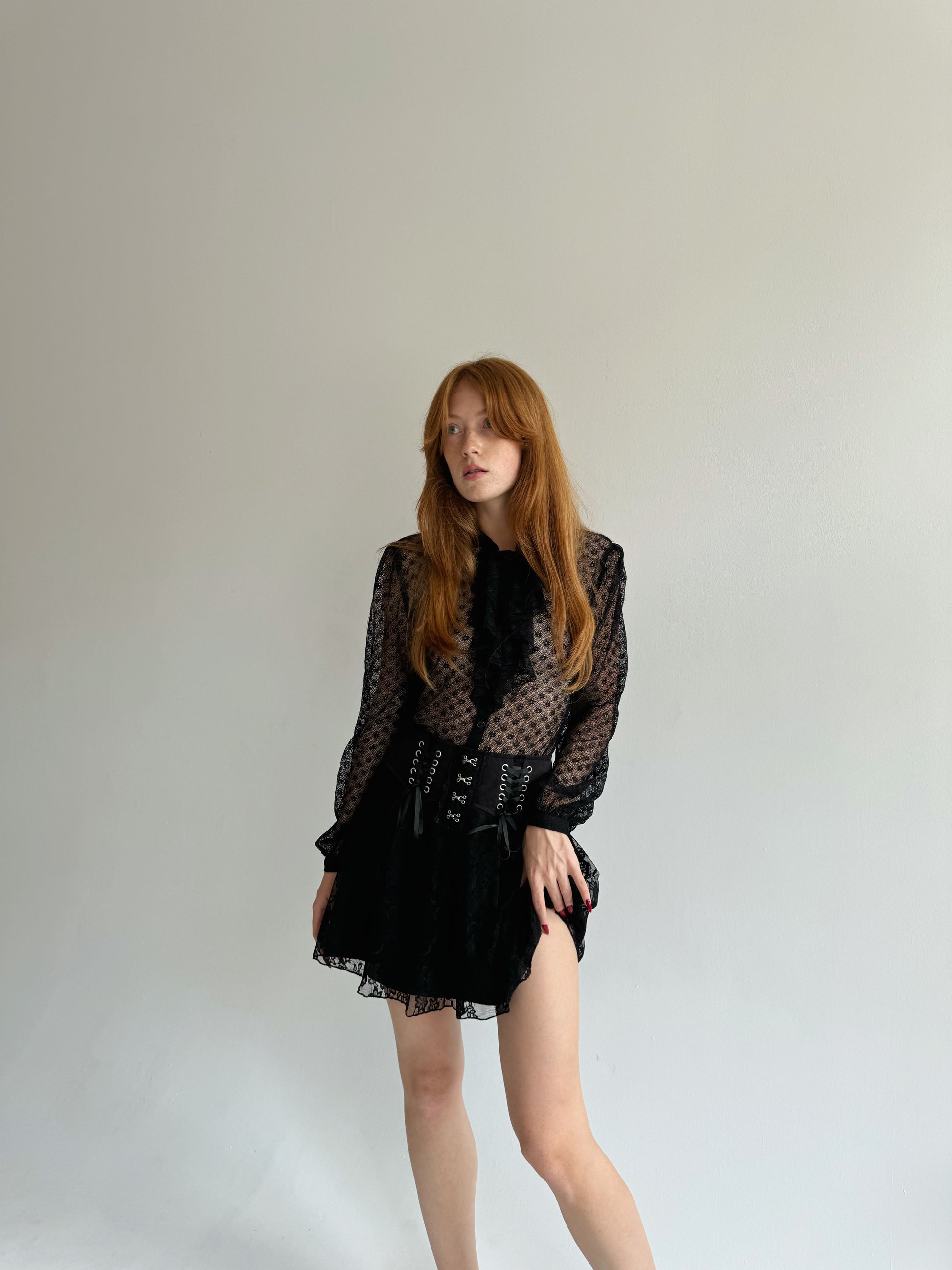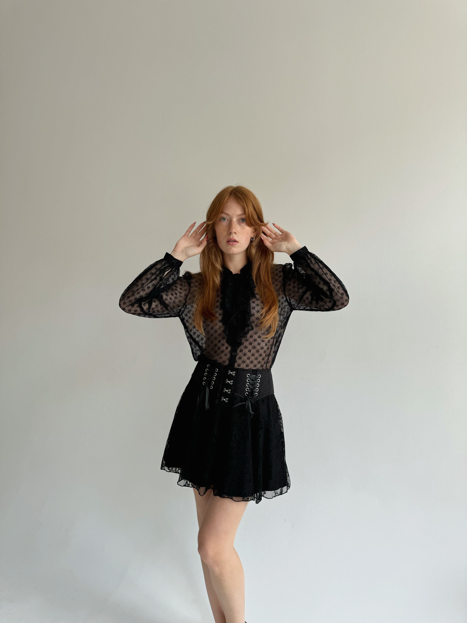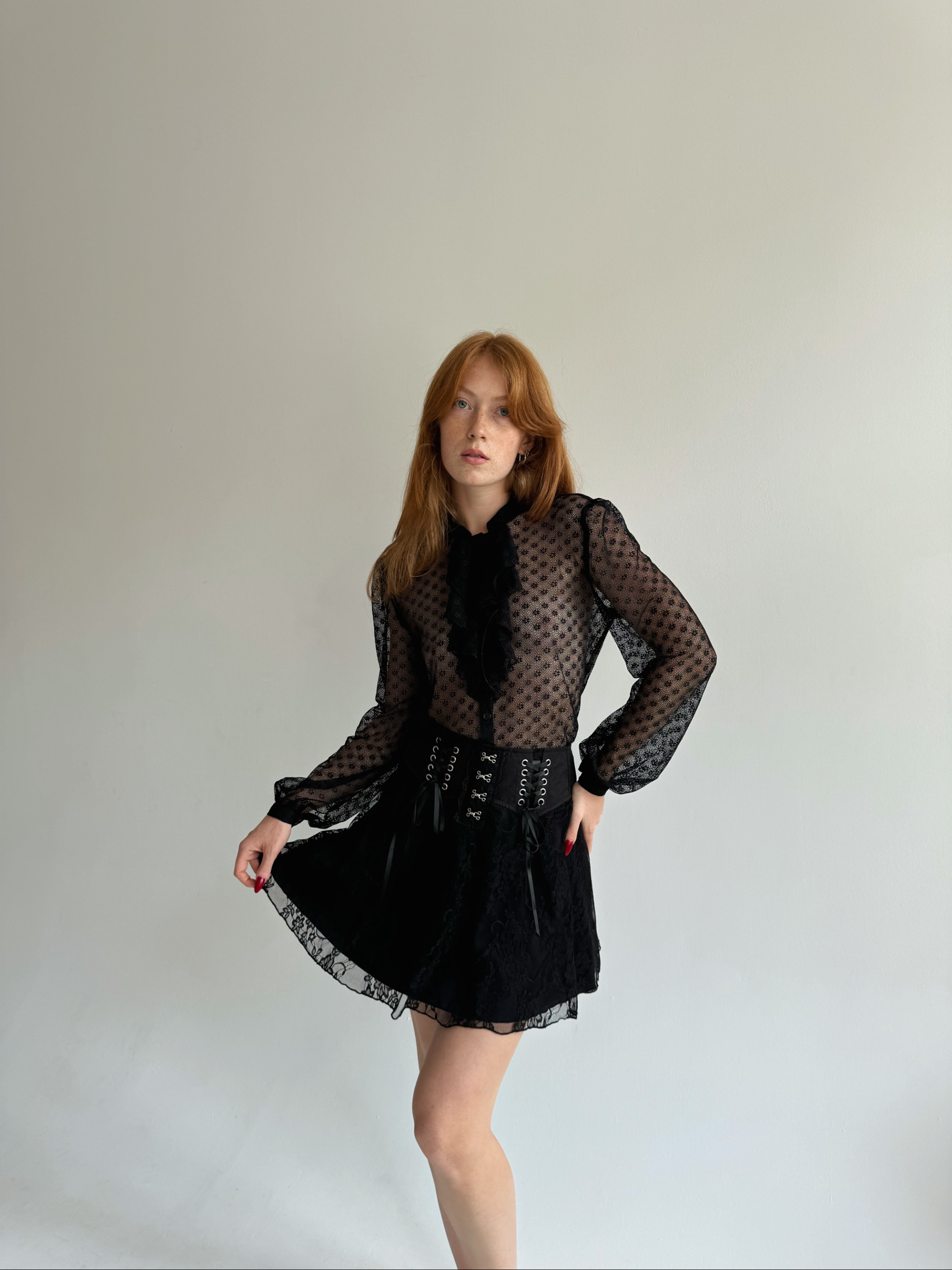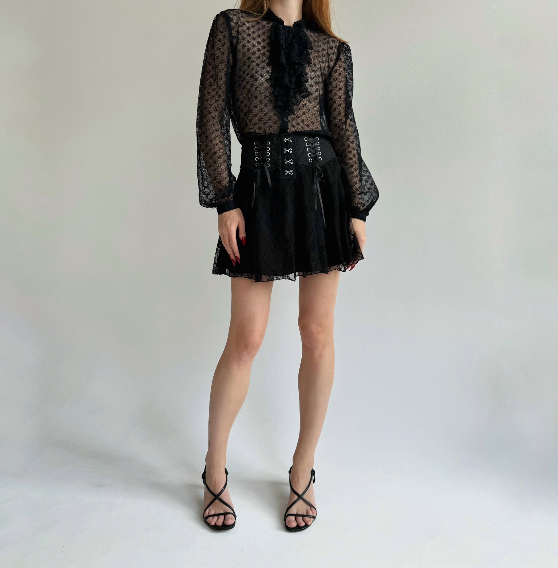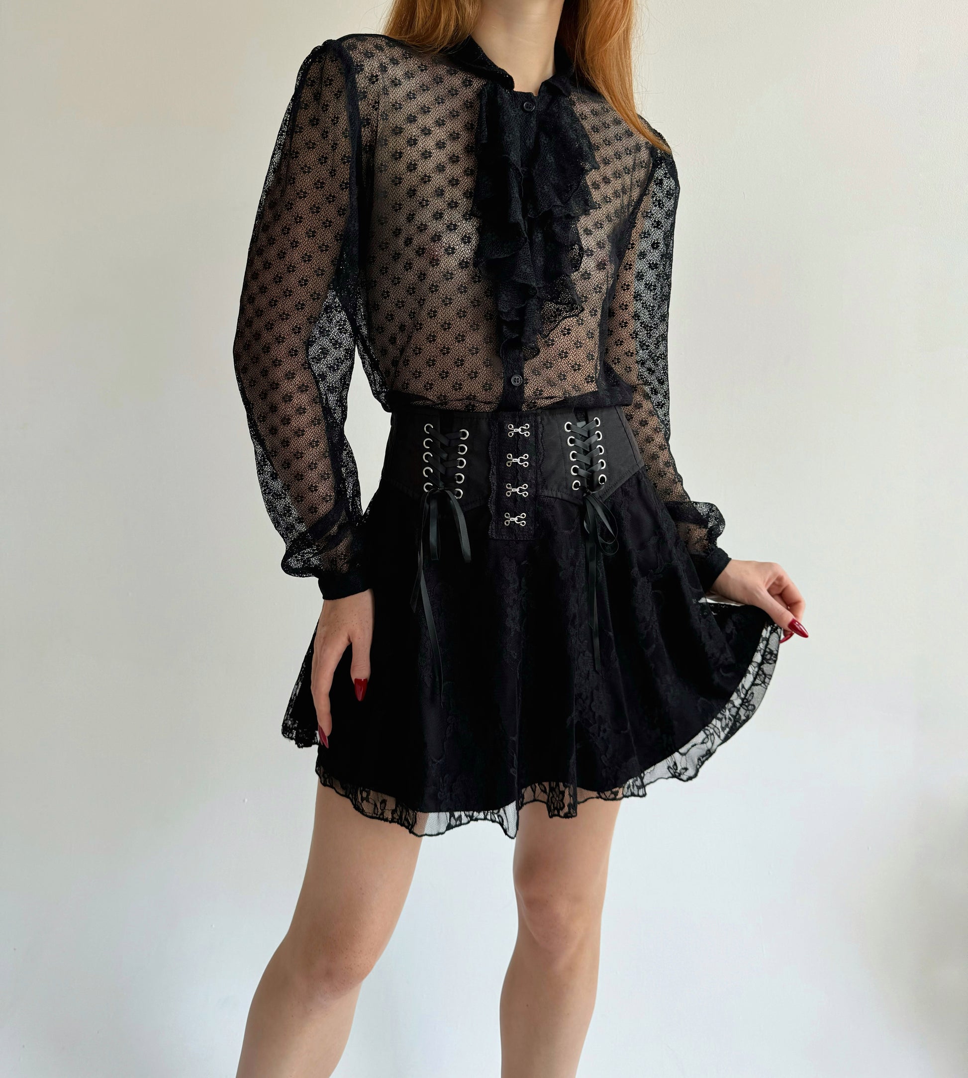 Y2K black gothic lace mini skirt with corset like lace up waist with hook eye closure