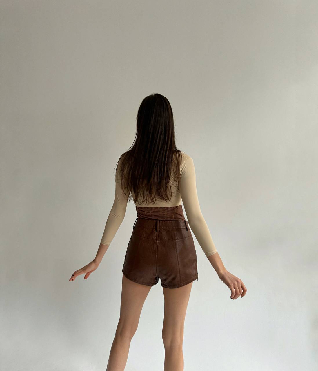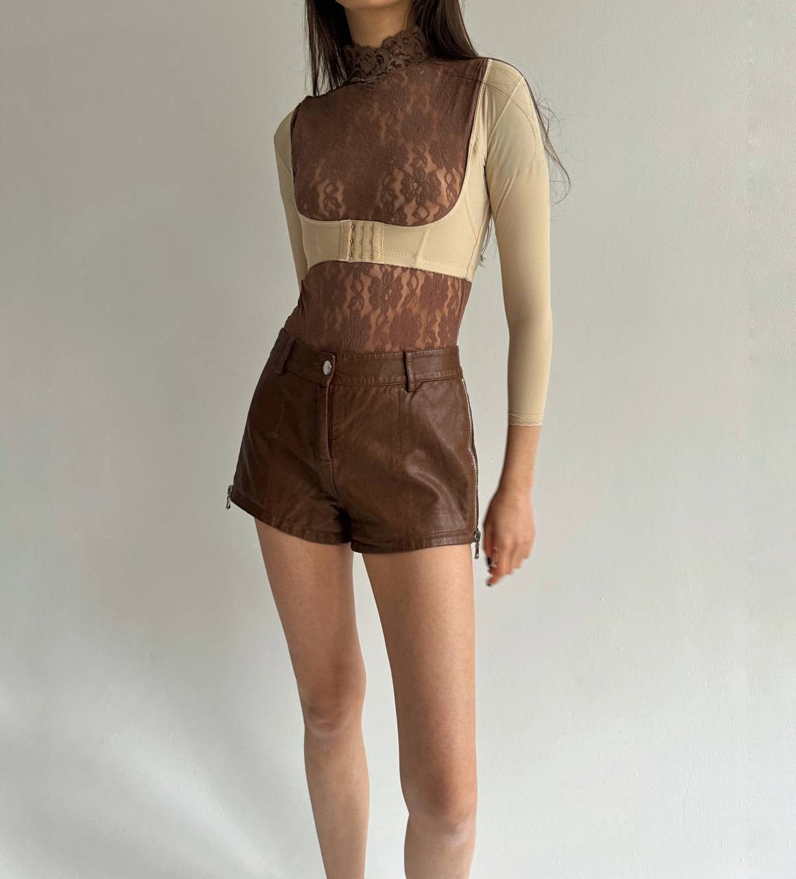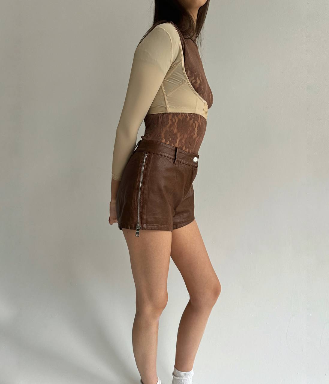 Y2K genuine leather brown high waisted shorts with zippers on both sides