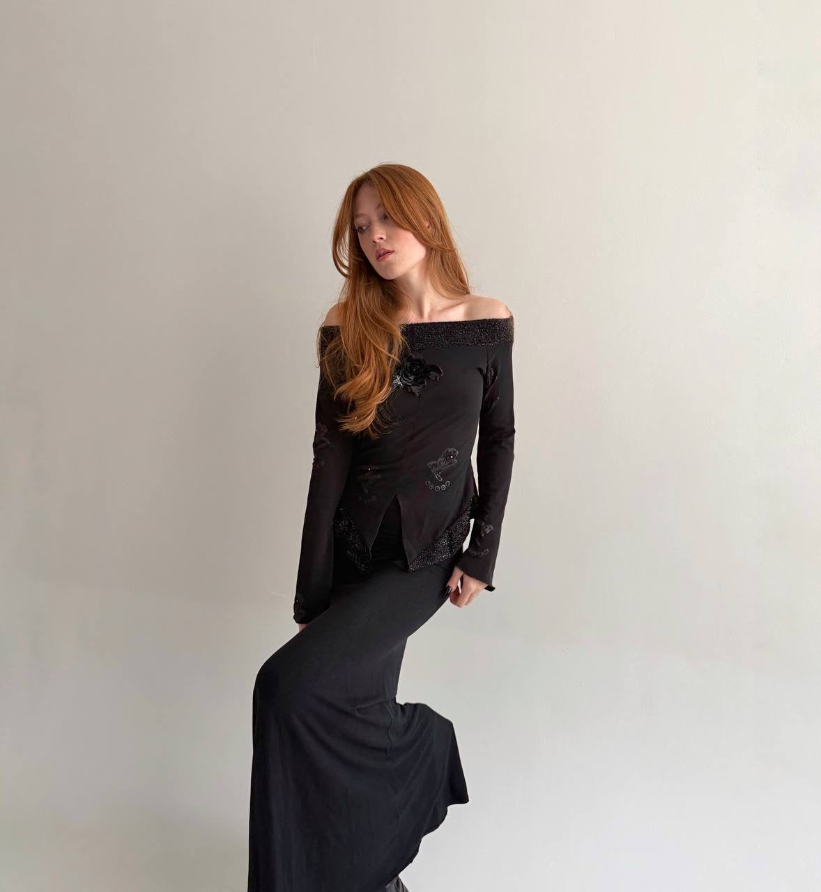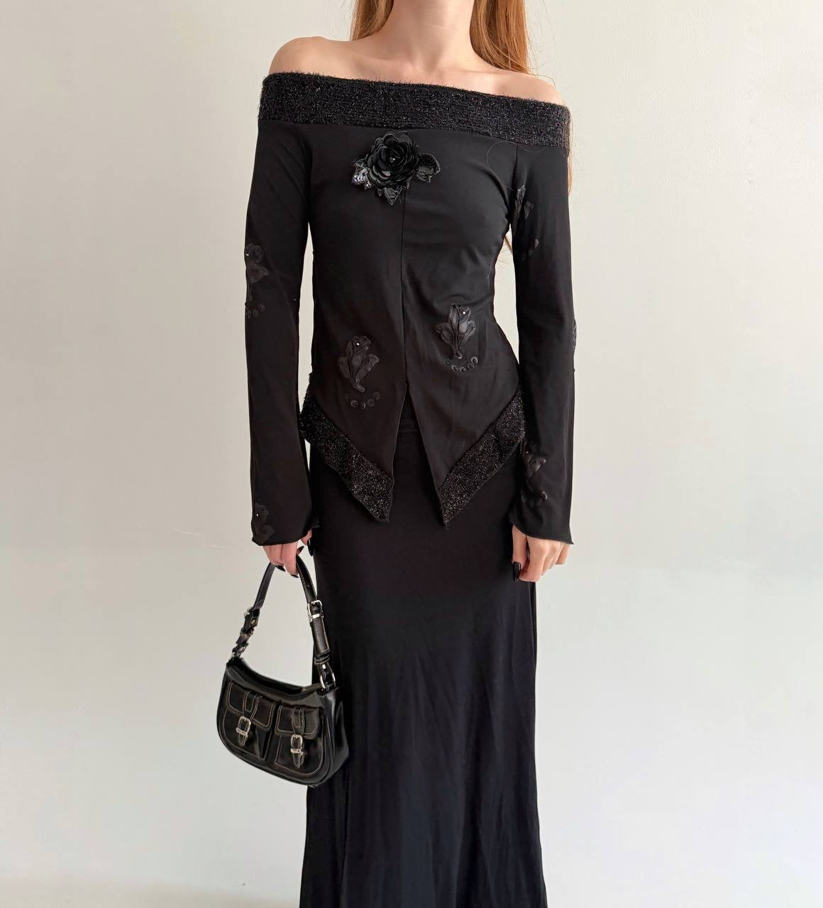 Vintage Y2K made in Italy black blouse with off the shoulder knitted lurex collar, sequin flower appliqué and embroidery