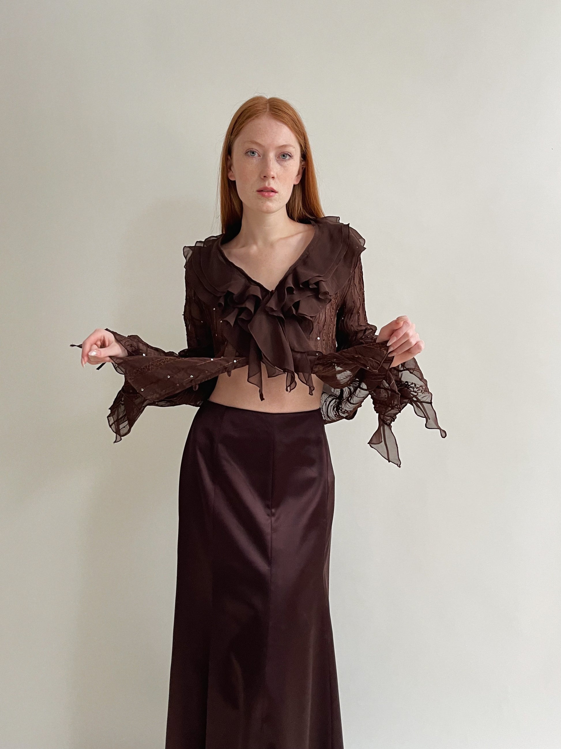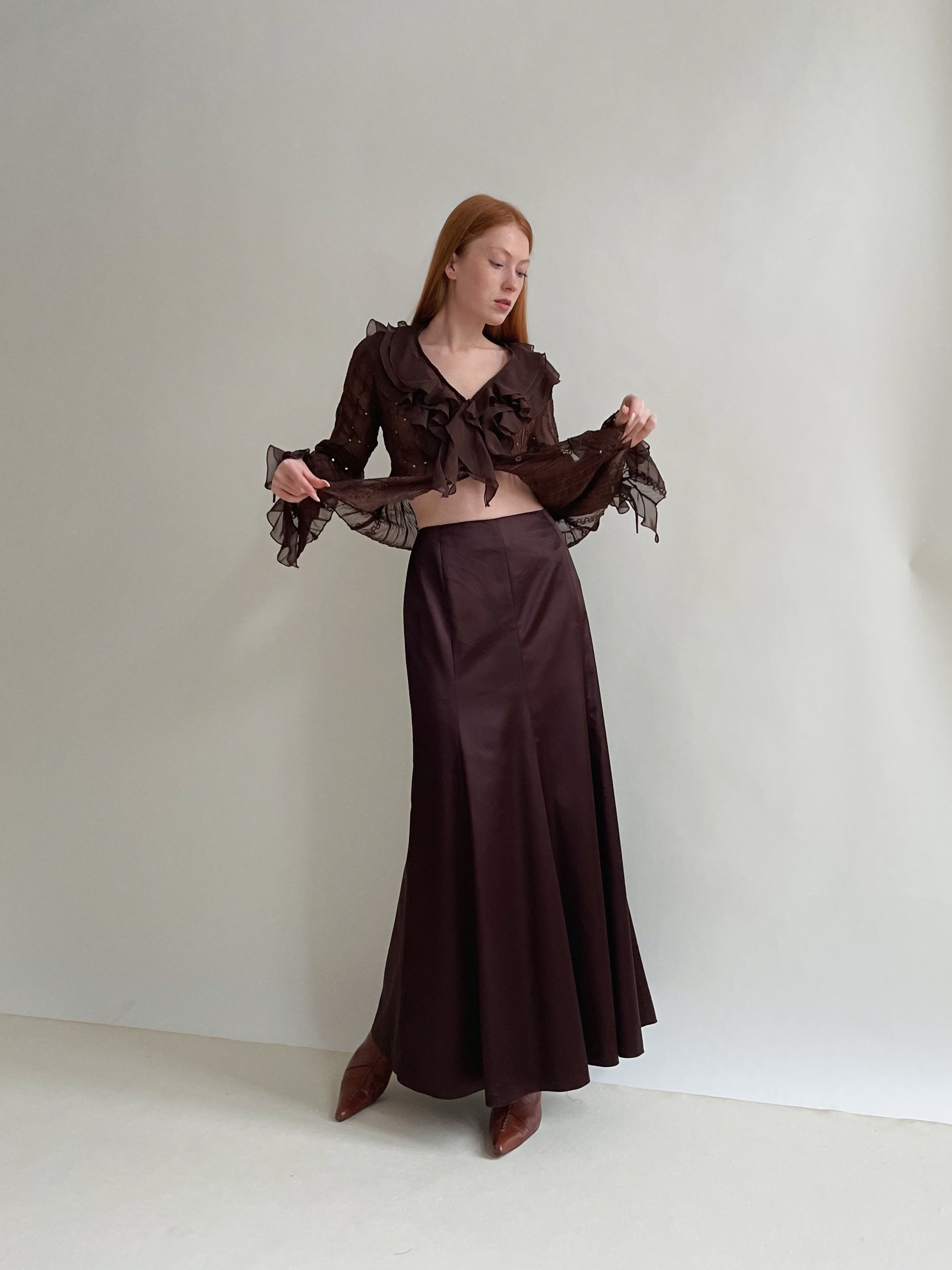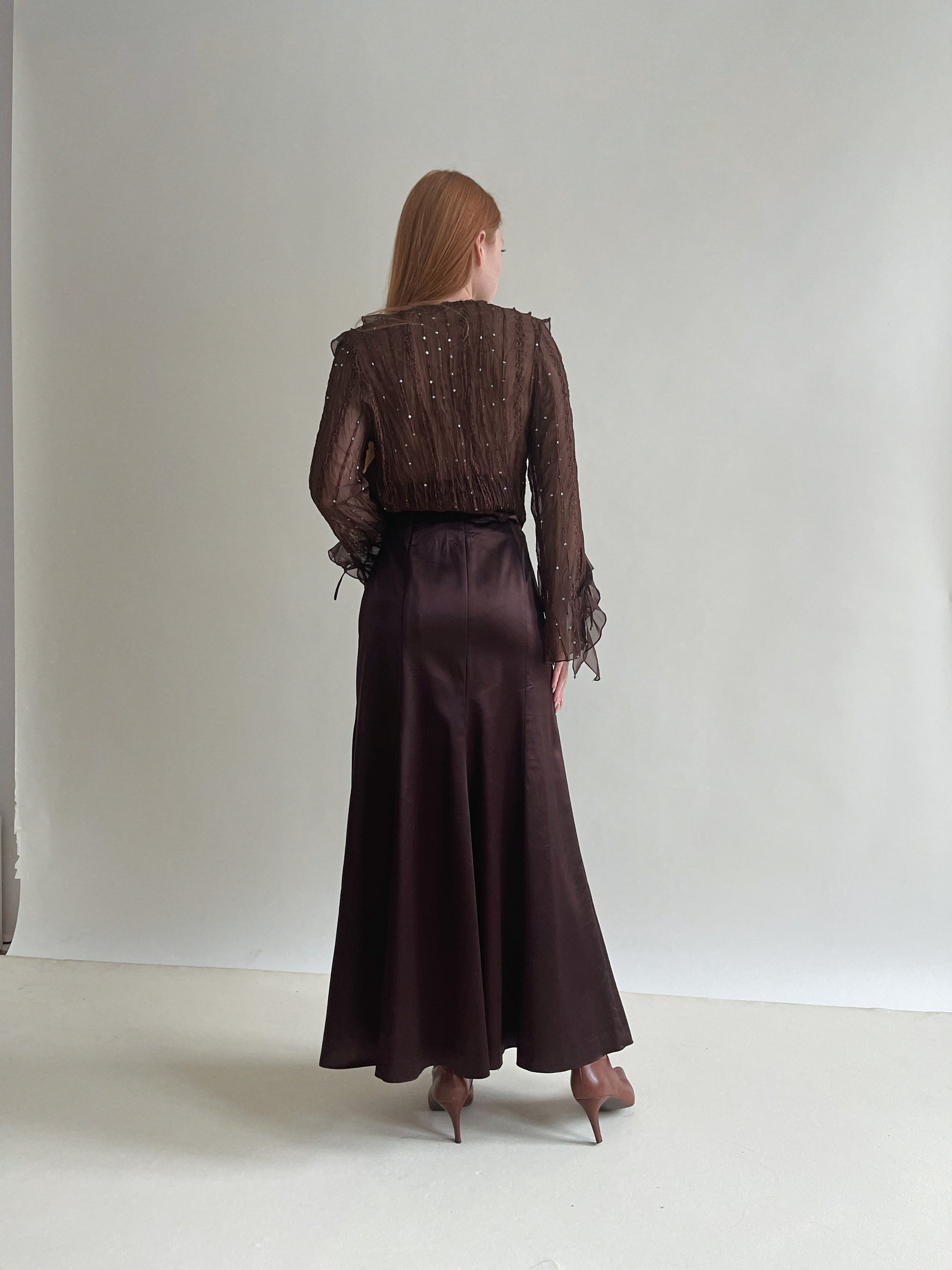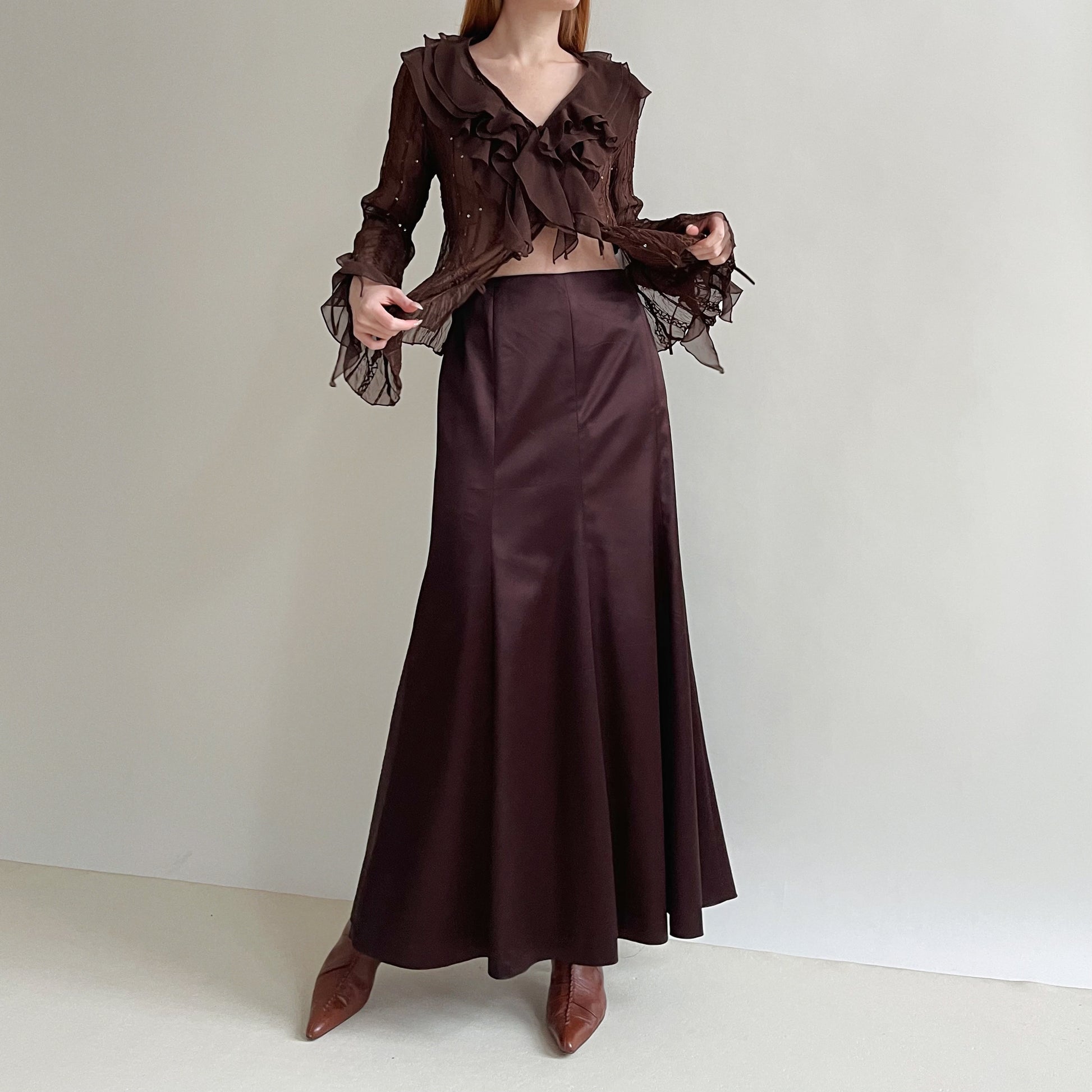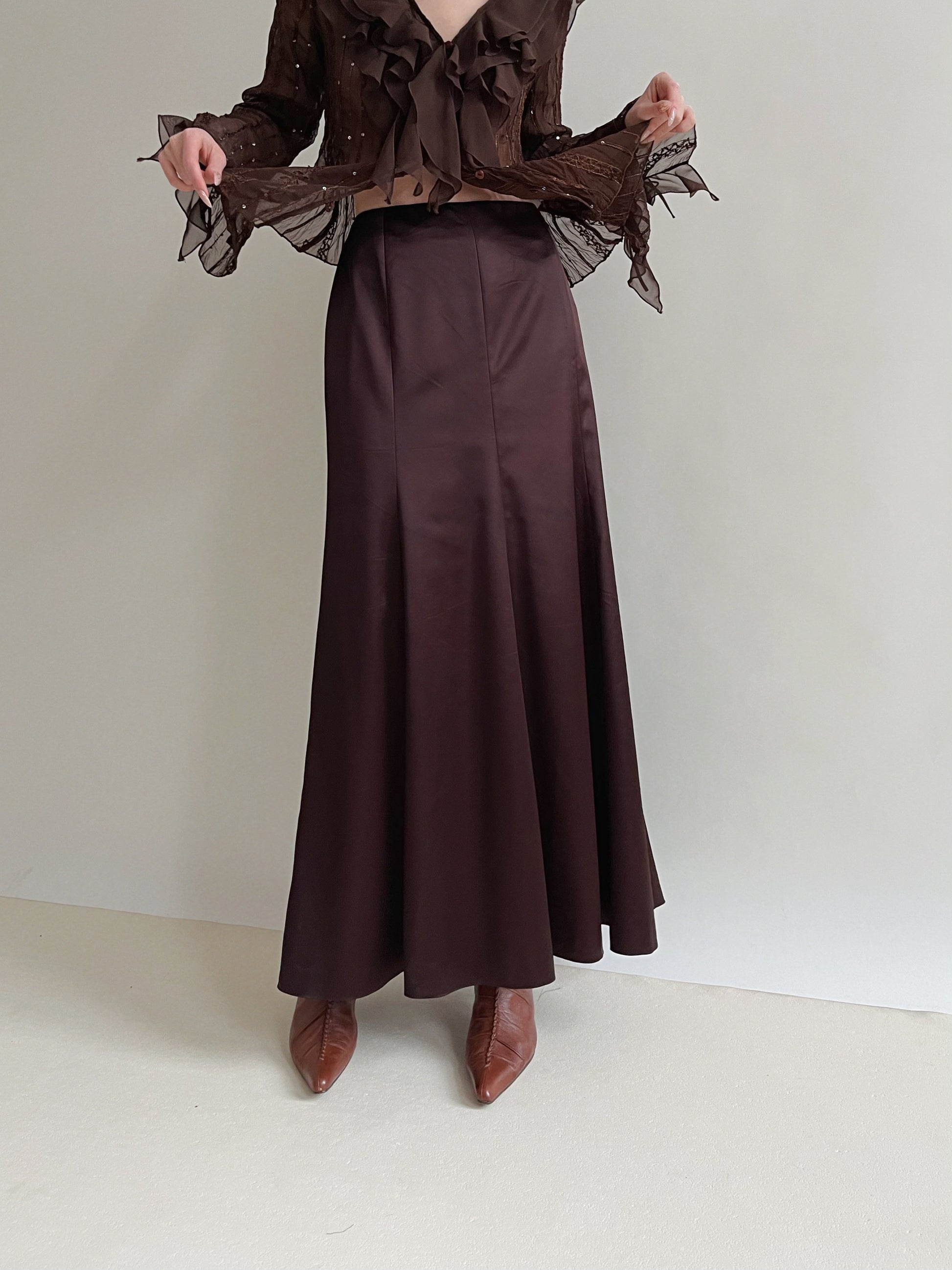 Y2K satin brown maxi long skirt