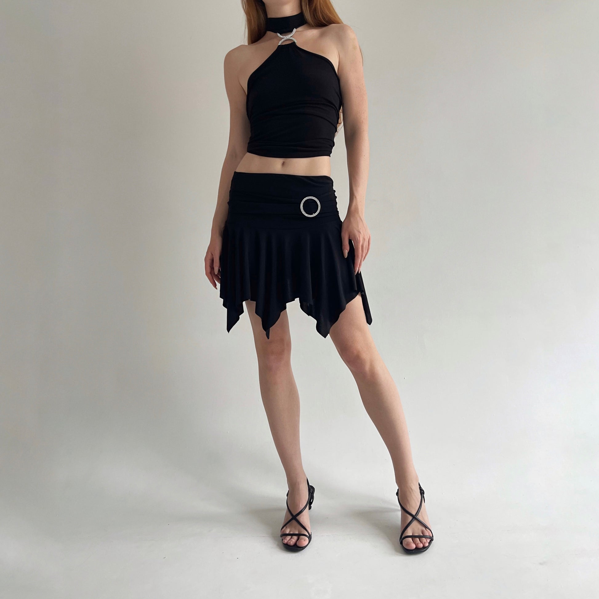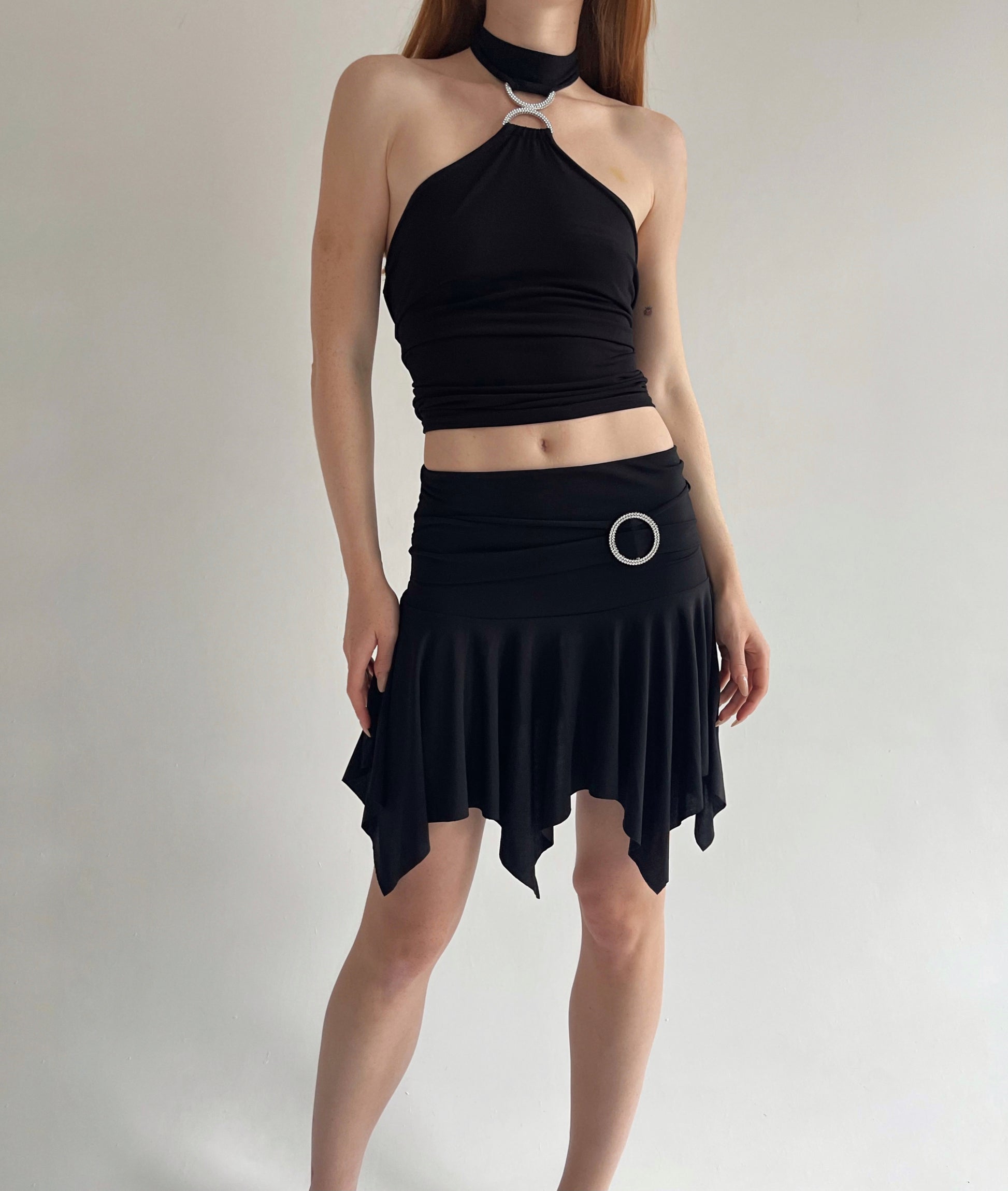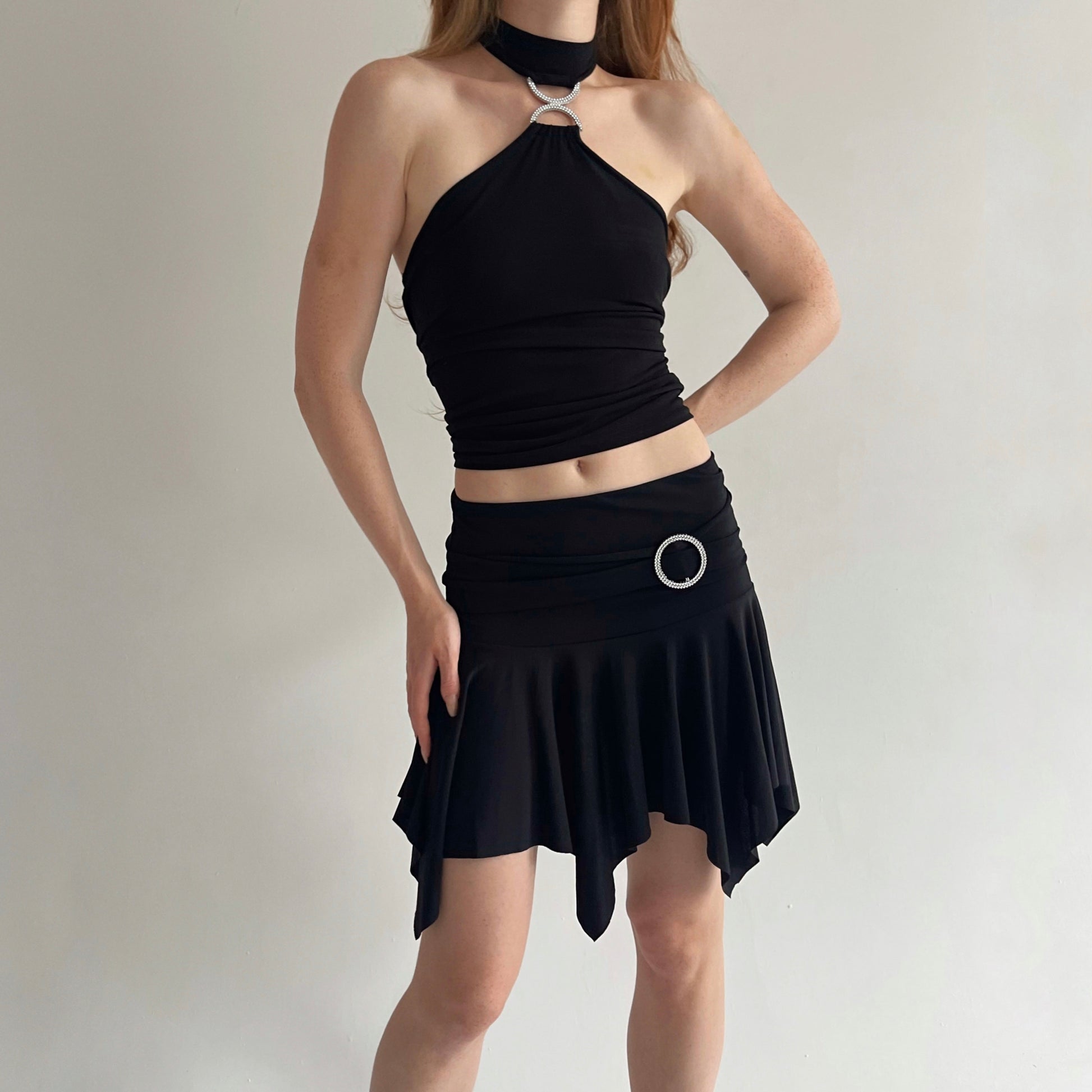 Y2K black stretchy asymmetrical trim mini dancing skirt with rhinestone circle buckle