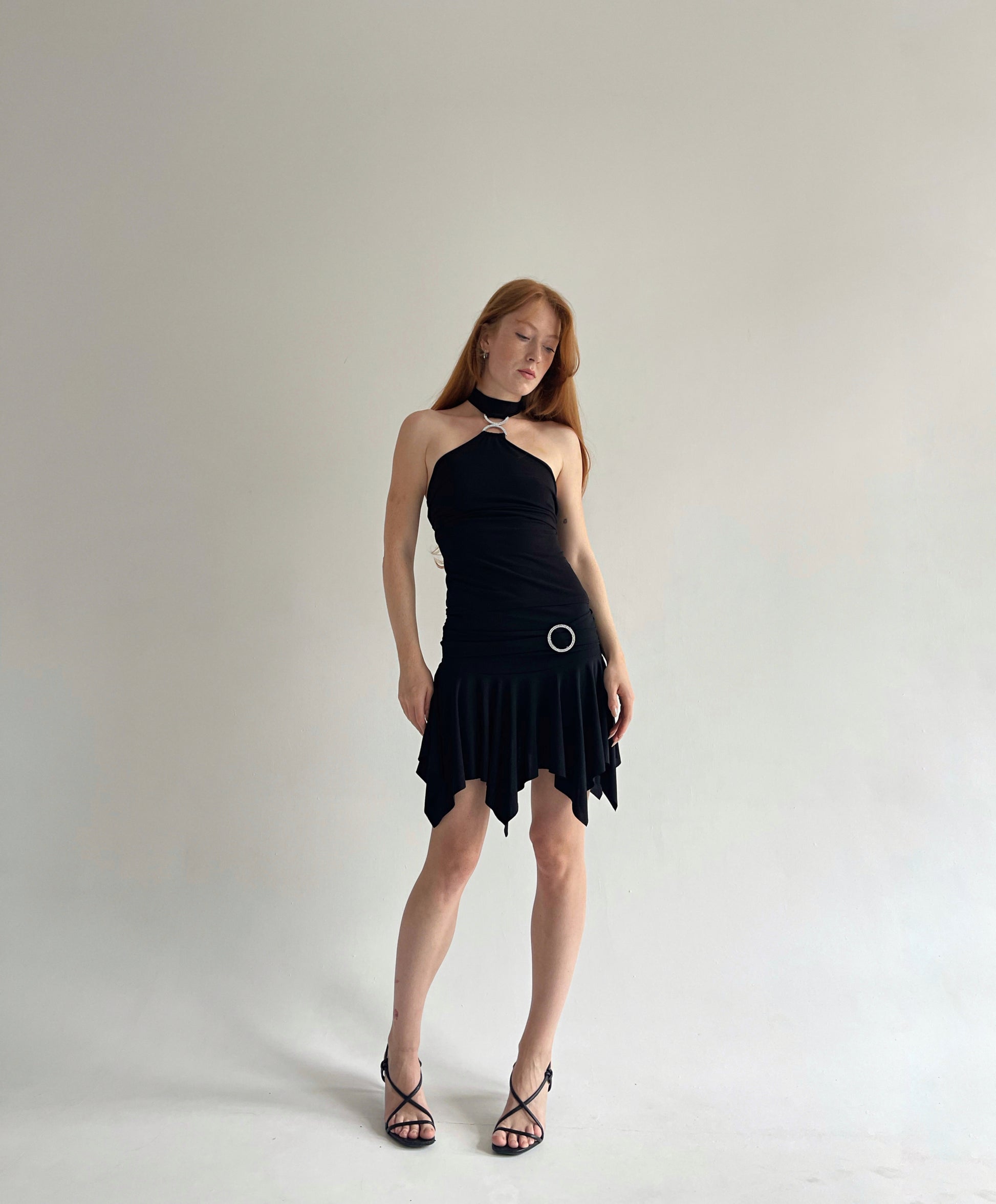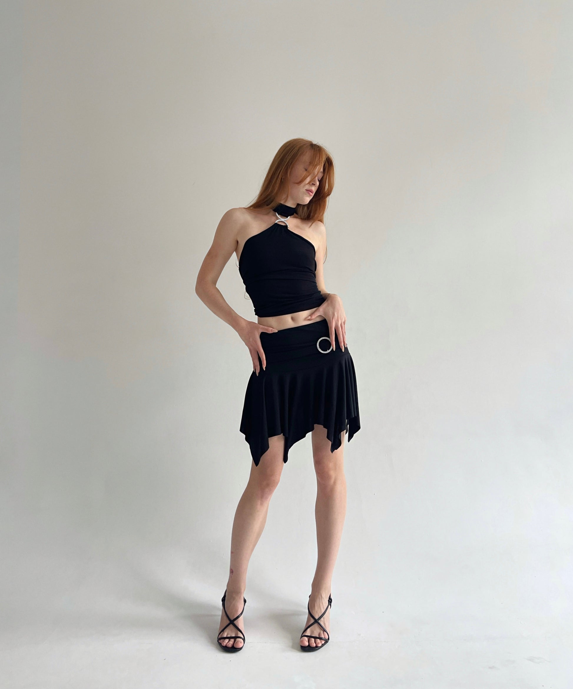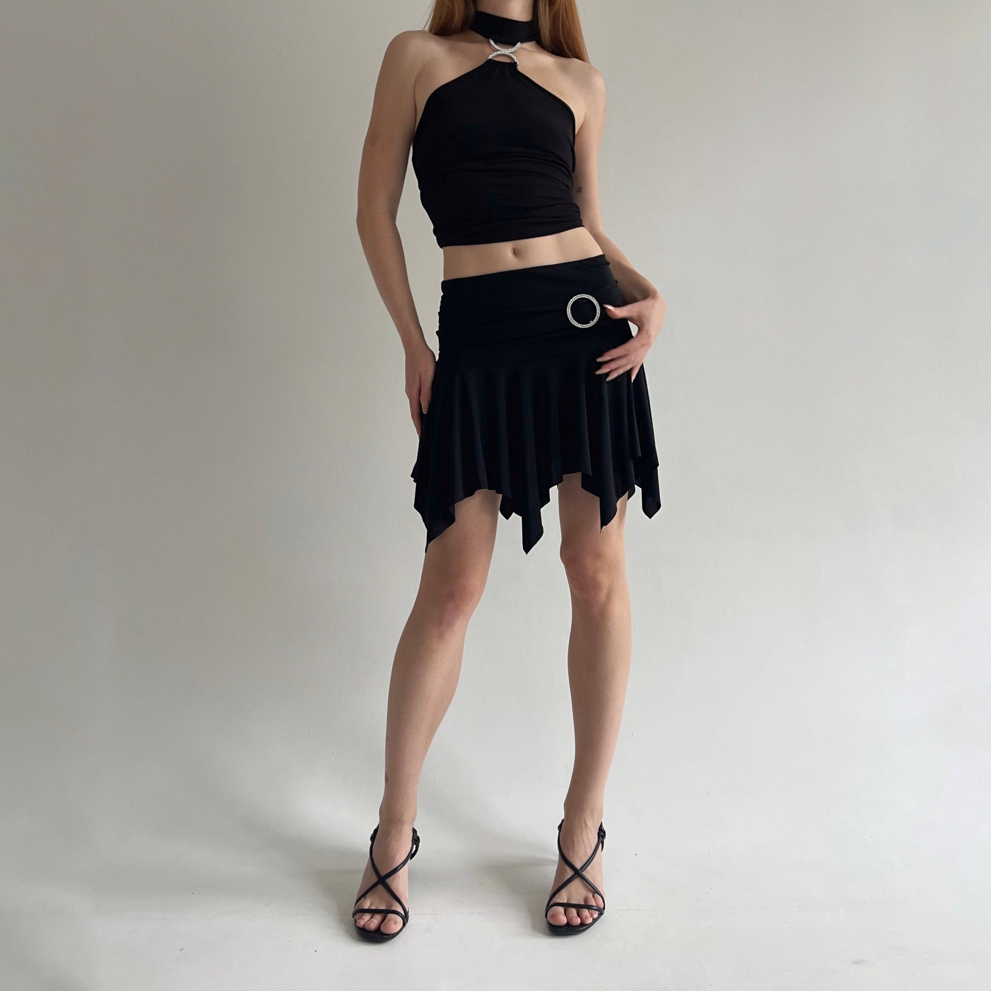 Y2K black stretchy asymmetrical trim mini dancing skirt with rhinestone circle buckle