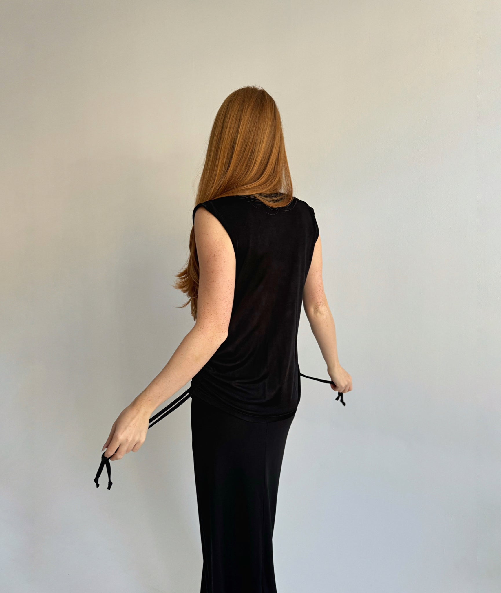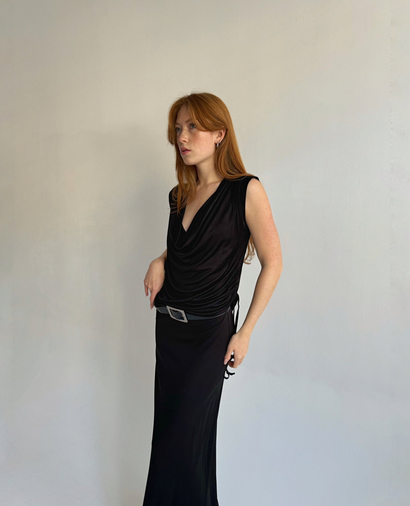 Vintage Y2K viscose black blouse with cowl neck and side gathering ties